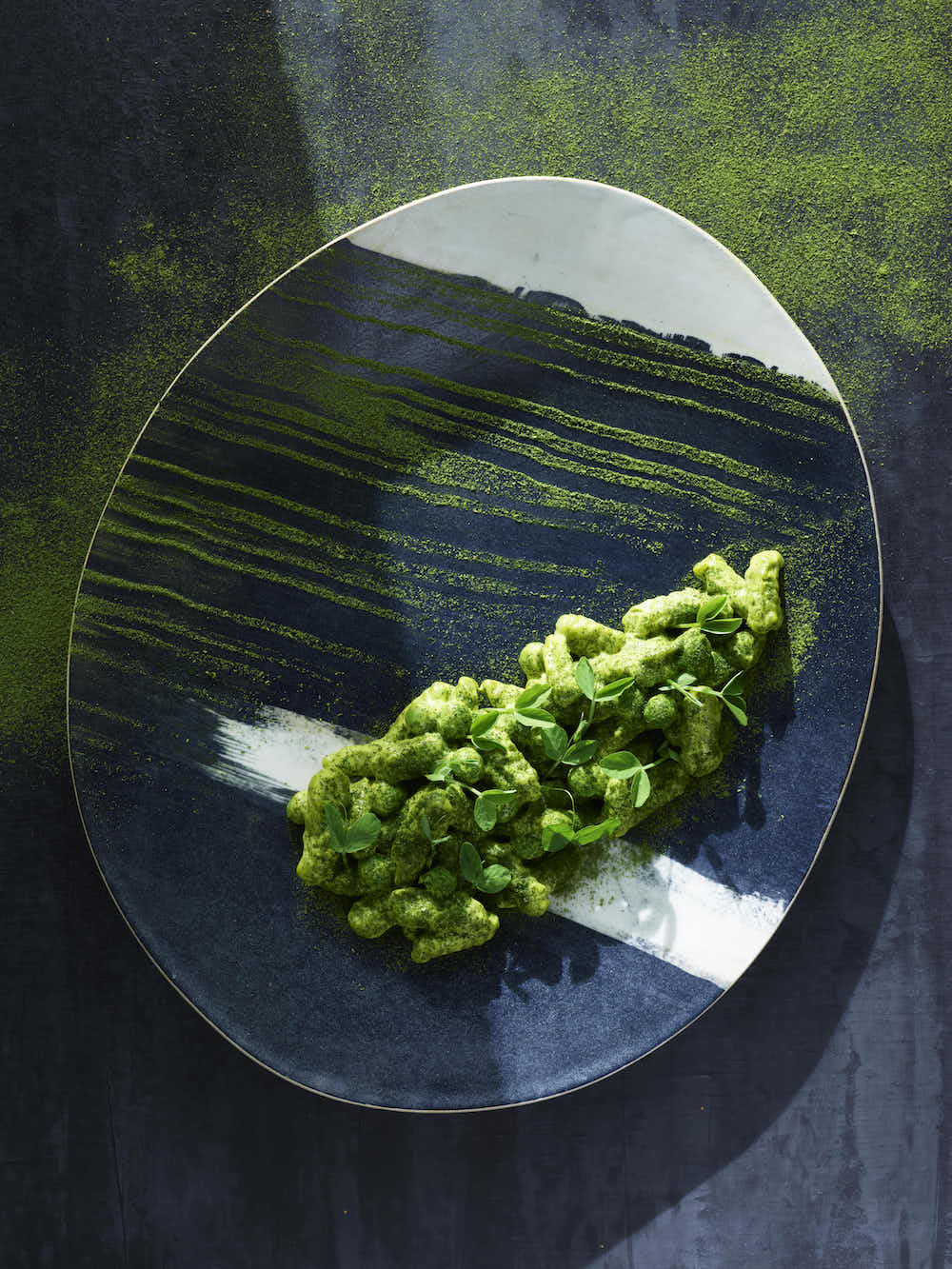 Bring back to a simmer and allow to cook for another 30 seconds. Fold in 2 tablespoons chiffonade mint and ¼ cup grated Parmigiano-Reggiano, and season with fresh lemon juice and kosher salt. With two large spoons, quenelle the pasta evenly amongst 4 plates. Garnish with pea tendrils and pea shoot powder.