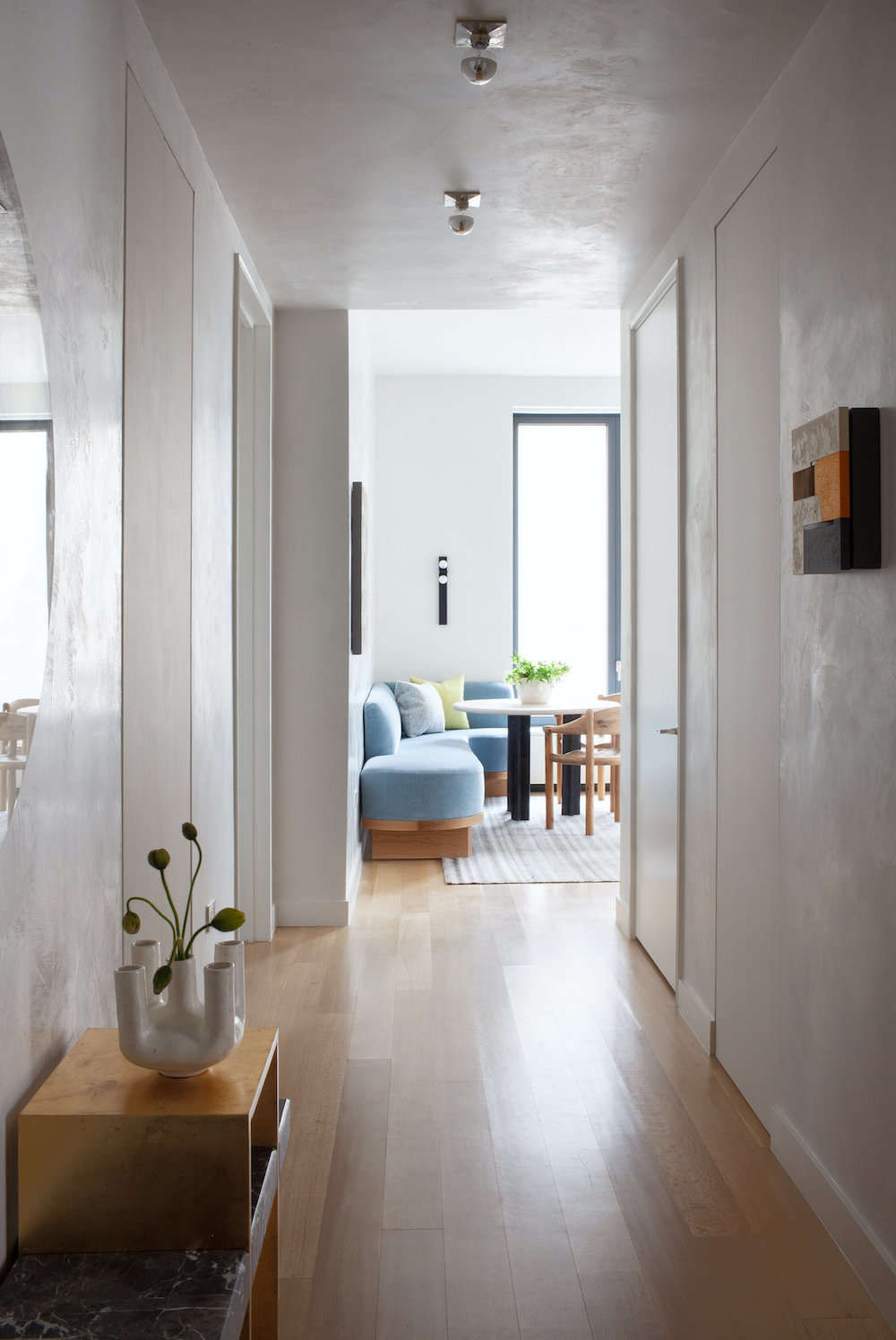 Seeking to create a quiet respite in the heart of the bustling, often noisy city, Sendich selected a palette of soft colors rendered in subtle textures. Although neutral, the walls throughout, for example, are clad in a textural matte plaster that appears to shift in tone with the changing light. “It adds another layer, and the light bouncing off it kind of moves your eye around the space,” Sendich explains.