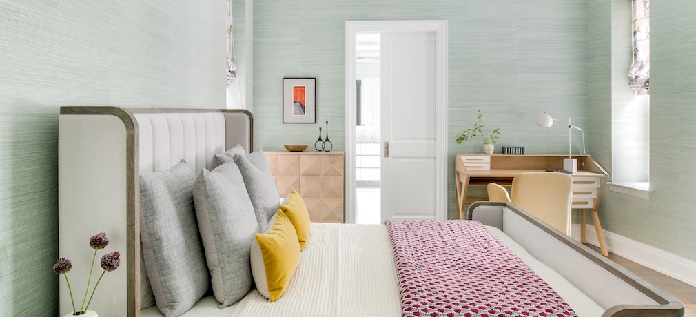 Wallcoverings also play a key role. Linen-clad walls foster a calming ambiance in the primary bedroom, where custom oak side tables with ebonized frames flank a headboard covered in upholstered silk. Paired with an elegant, handblown pendant light in a cloud-like shape, a woven silk wallcovering likewise softens the weighty stone sink in the sophisticated powder room. “New York can be hard and difficult, and I wanted to create a calm space for them,” Sendich admits.