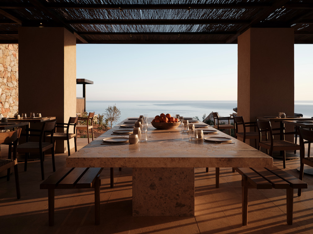 Designed in Block722’s signature warm minimalism, which also, importantly, echoes the Cycladic architectural traditions, the resort is pared down and understated. Yet, it is rich in conceptual layering and physical textures through a palette made entirely of natural materials and colors. Marble, wood, and clay play a key role in interiors and exteriors, while much of the natural stone and gravel used in the resort was recycled from the site, ensuring a gentle circularity in its construction. This way, both conceptually and physically, the spaces, clad in earthy tones such as soft beige and warm grey, make for an inviting, subtly luxurious and respectful setting. Hand-picked art, ceramics, and music complement and reinforce this feeling of serenity throughout the resort. Meanwhile, bespoke built-in and freestanding furniture pieces designed by Block722 complete the design, mixed with vintage finds.