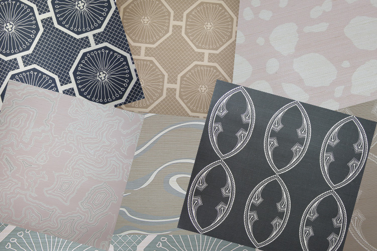 “We’ve done the Buscemi grasscloth in a powder room and a foyer, and the Moxie pattern on a ceiling. They’re very versatile for different rooms,” she notes. “Grasscloth gives a softer, more elegant look.”