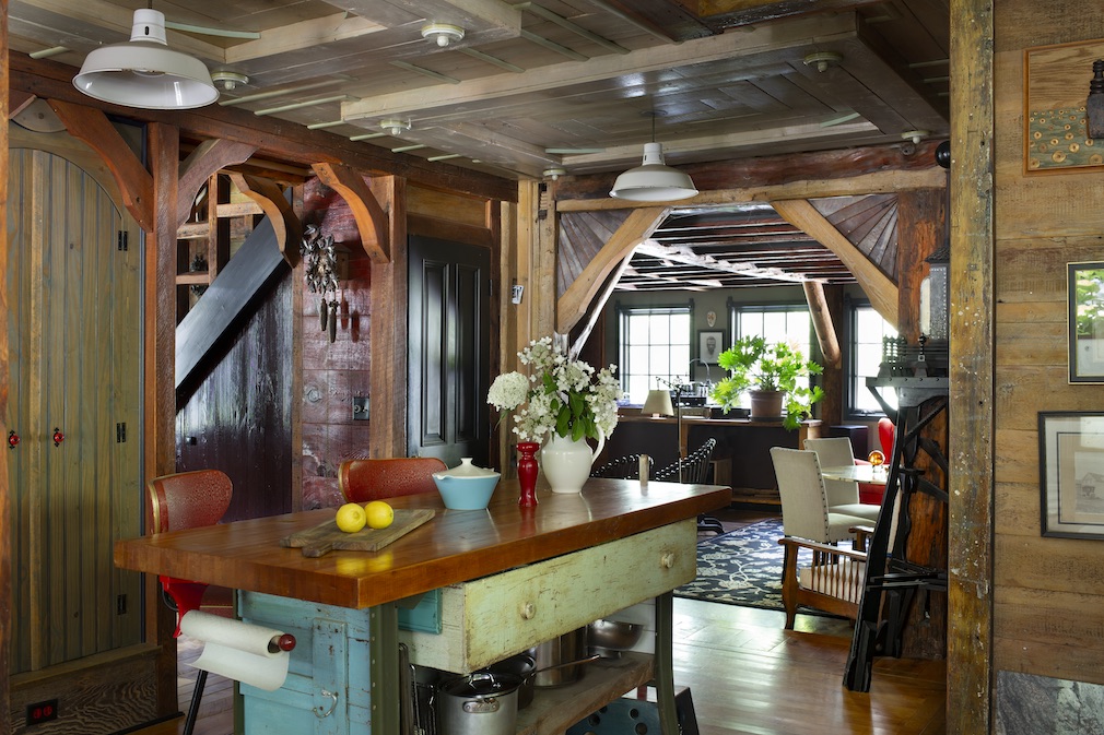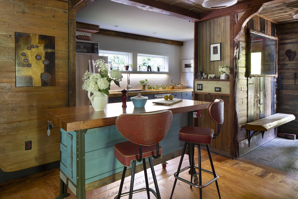 The kitchen island is a “Frankenstein table” Matt Hausmann built from various other pieces of furniture. The German cuckoo clock is from a friend. The ceiling is made of old palette wood.