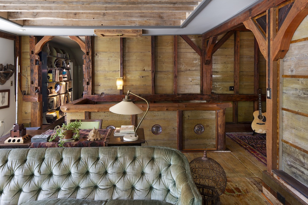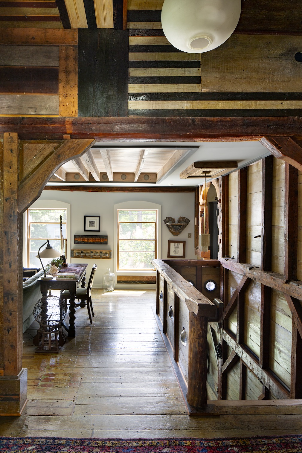 The 3,000-square-foot, circa 1830s post-and-beam building stood like a ship’s prow at the convergence of three roads in the tiny Catskills hamlet of Durham. “It had been condemned and abandoned,” recalls Amy Hausmann, a curator and arts administrator who is currently executive director of the Maine Arts Commission. “The windows were broken, there was graffiti all over, garbage inside the house, the outside was visible through the dining room wall slats.” To add insult to injury, the resident raccoon population had left the new tenants their droppings.