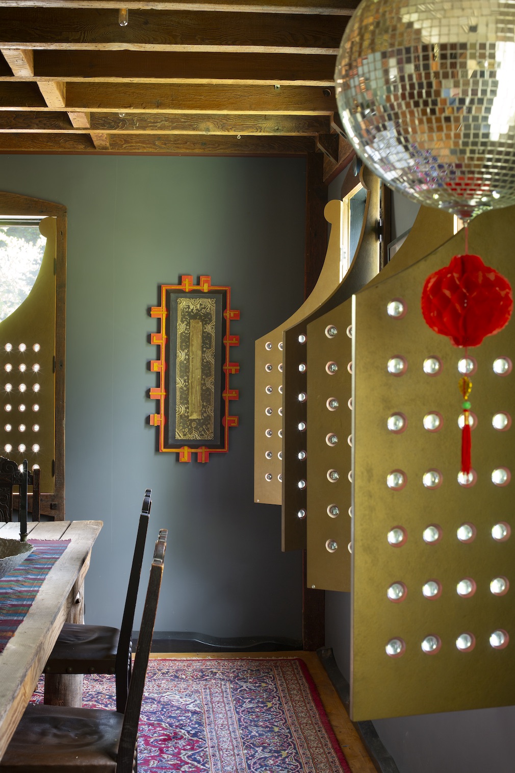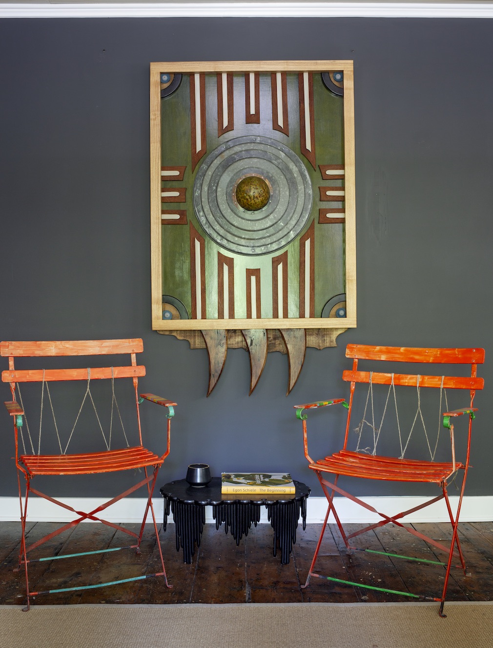 Matt completely disassembled the structure and rebuilt it, filling 10 dumpsters in the process. He didn’t have a specific plan. “It was pretty intuitive, very stream-of-consciousness,” he admits. “Everything is based on the material I’m working with.” That describes his approach to artmaking, too. Matt is a man with scant regard for divisions between categories like art, architecture, building and craft. It’s all of a piece to him. One work started with an antique trash can lid whose metal form, patina and patterns he found intriguing. By building elements around the lid, it became a shield-like artwork that now lives between two cadmium red-painted French garden chairs and an heirloom lacquered Japanese tea table.
