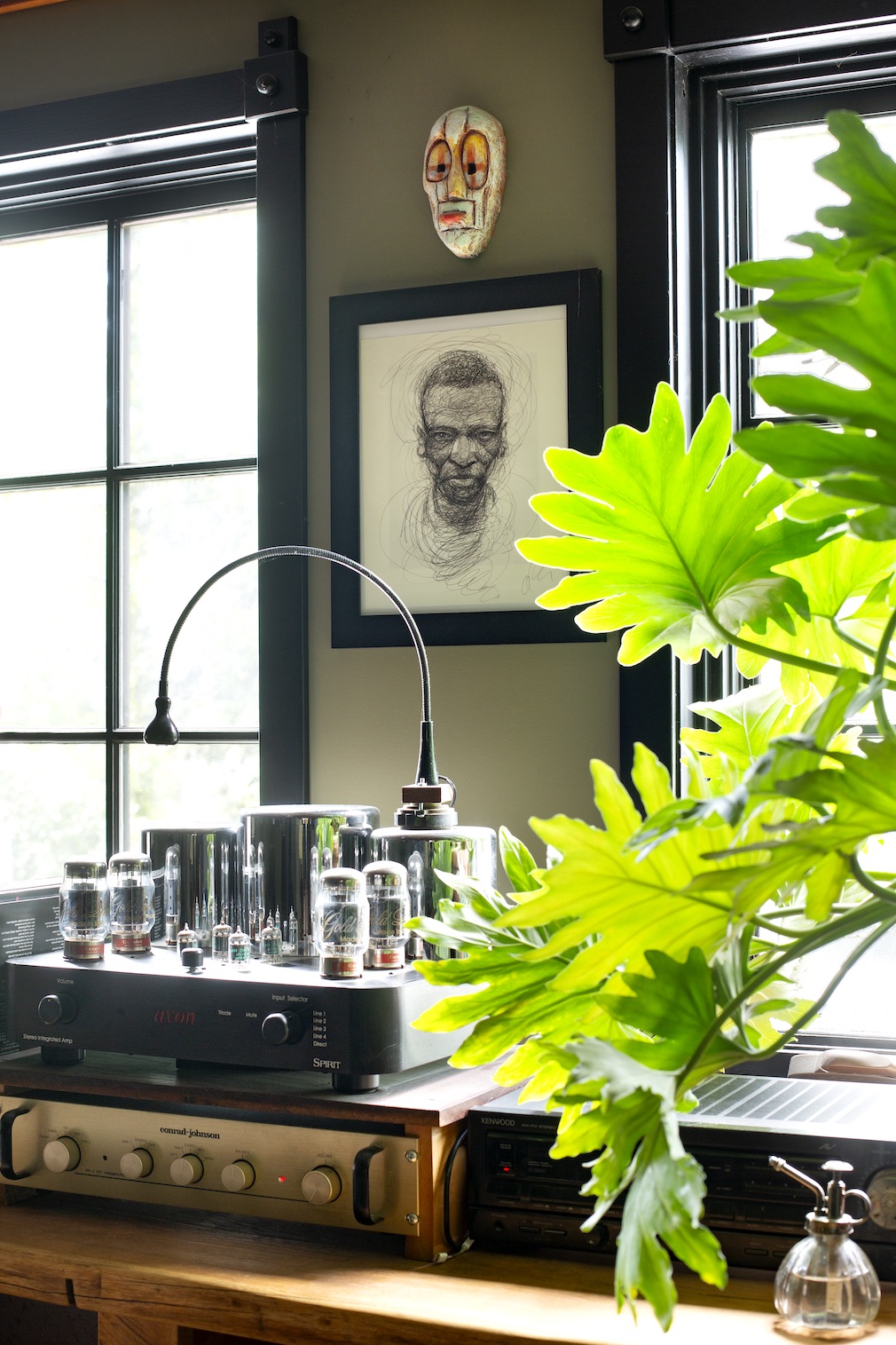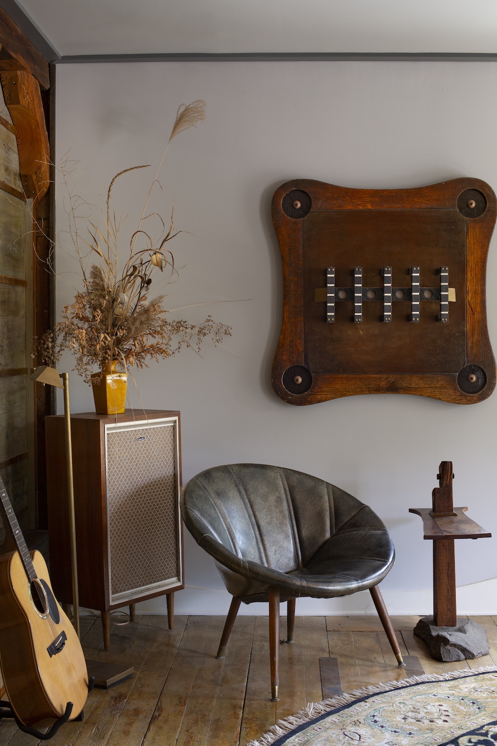Furnishing the house followed the same nondirected direction. Hand-me-downs (a desk lamp from Amy’s childhood, a mirror that belonged to her father’s secretary, a one-time Playboy bunny), garage sale and flea market finds (1960s lamps, midcentury speakers), auction acquisitions (a pair of 1880s George Jakob Hunziger “lollipop chairs,” a bird cage), Craigslist discoveries (the shooting marbles, all windows, a sofa) and gifts and bequests from friends (a German cuckoo clock, the folding garden chairs)… all of it layers and blends with Matt’s own eccentric creations.