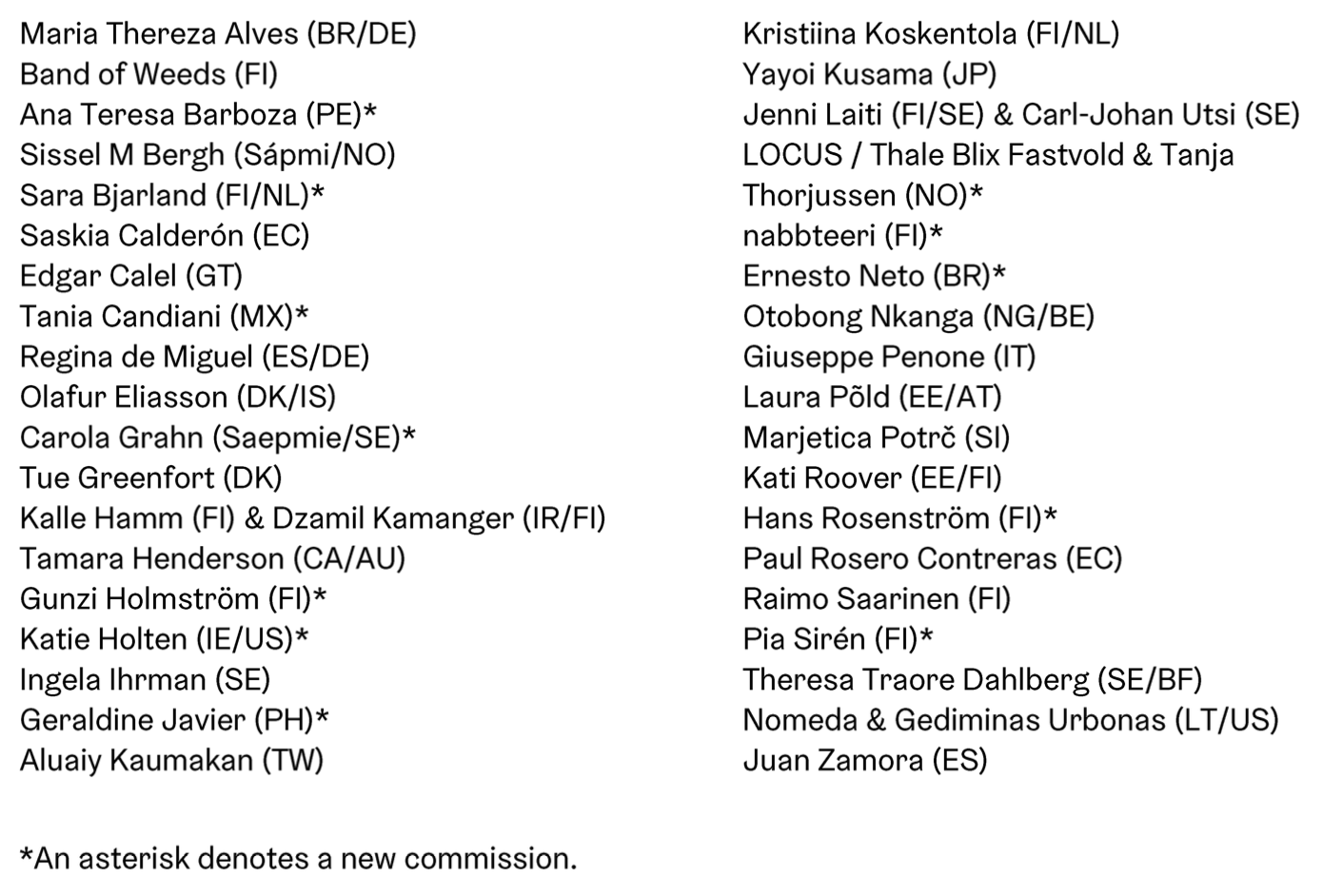 The Helsinki Biennial continues to invite dialogue and works by artists from across the globe who will present new commissions as well as new works and editions. The 2025 biennial will see particular emphasis on artists from the wider Nordic region, Latin America and Asia, and aims to incorporate the worldviews of Indigenous representatives. Participants include: