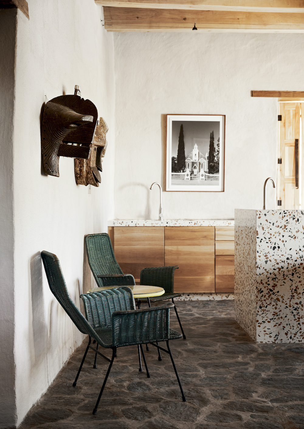 From mounted African masks to olive-green dining stools, it’s in the kitchen where their eclectic choices really reflect the fun he had in pulling the project together. Truen designed and installed a raw poplar table, which hugs a surprisingly contemporary terrazzo kitchen island. The quiet cream stone is polka-dotted with stones ranging from terracotta to black, giving it an edge, and simply reflects the natural shades of the valley’s landscape.