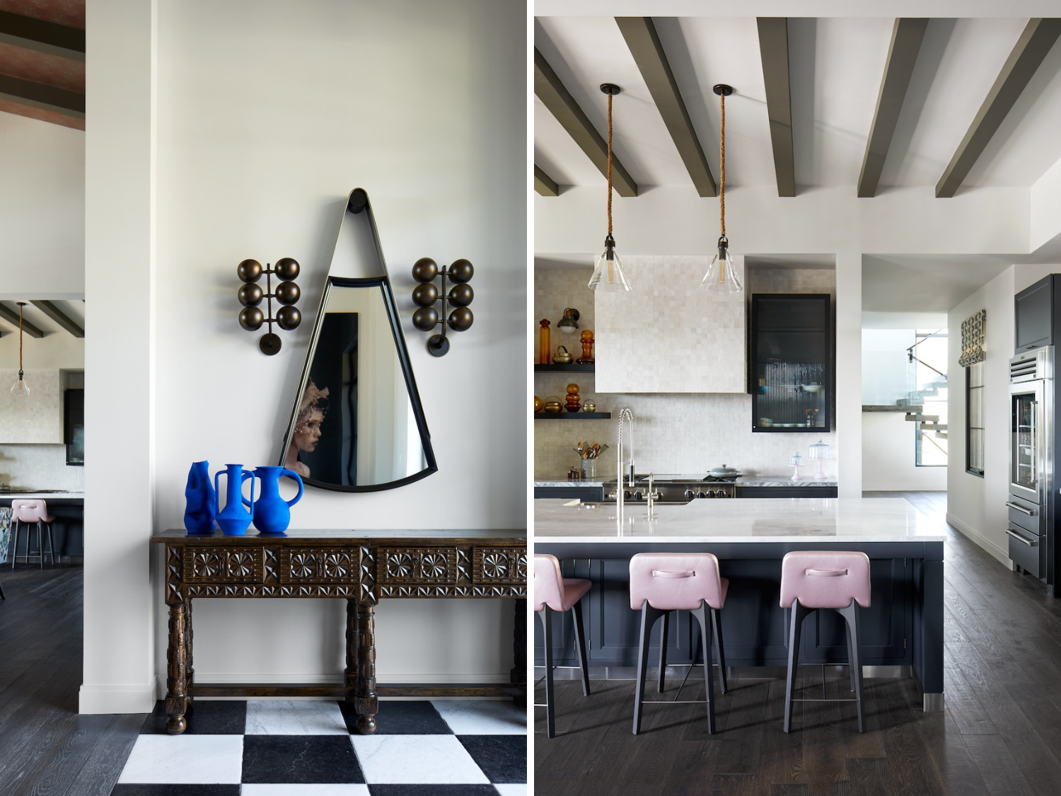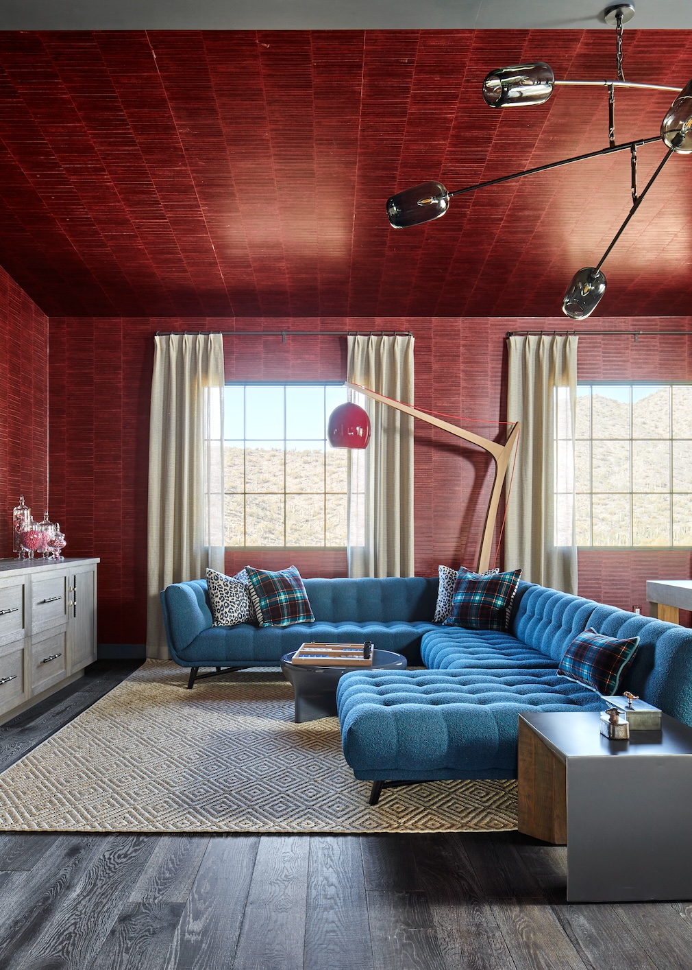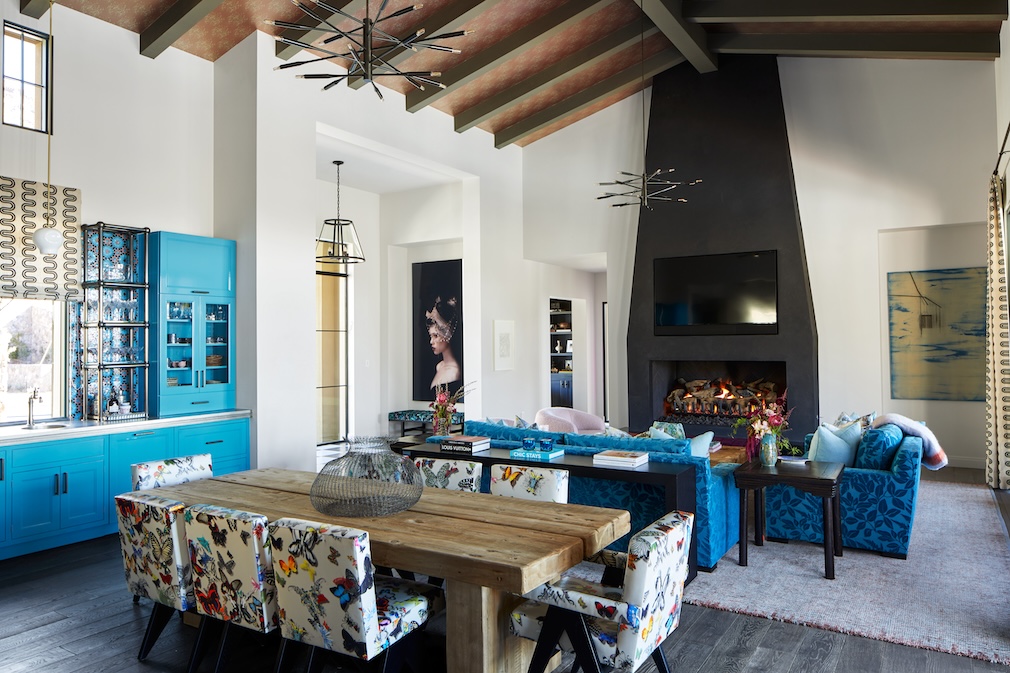 Wohlner notes the house is “interesting, as it’s not a typical Arizona house in terms of design. It’s much more whimsical,” she explains, noting the client herself is “very whimsical. When I first met her, she had on pink shoes and turquoise sunglasses, and I knew exactly how I was going to do this house.” The client shared desires for an industrial, almost rustic feel, nothing overly formal. Throughout, the new home and its individual spaces bring in elements like antique and vintage finds, rich textures and a connecting palette of blues – inspired by those sunglasses – that bring history and warmth to the just over 6,000-square-foot home. And ceiling treatments in multiple areas, like decorative wood beams and wallcoverings, serve to bring a coziness to large-scale spaces. “I don’t love enormous homes,” the designer shares. “Wallpapering the ceilings brings them down and makes you feel like you’re kind of surrounded, almost womb-like. That connected feeling is so important in a bigger home.”