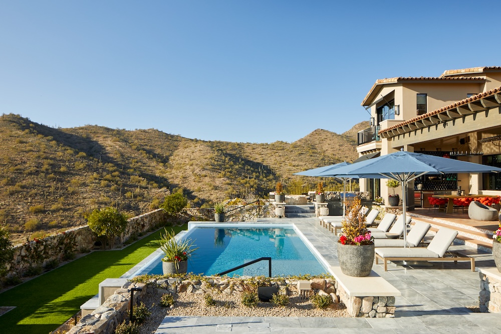 With Arizona a desired target for second homeownership, knowing when a client plans to live in the home is just as important as how they would like to live in it. This particular lot sloped gently from the northeast to the southwest, allowing for the pool and extensive outdoor living space to be positioned on the desired southwest side, and for the great room, the primary living spaces and the second-story guest suite to be situated so they all enjoy the pristine mountain and valley views. “One of the characteristics of my designs is natural light in the rooms,” Peterson shares. “We try to make sure every room has a really nice proportion of natural light, and when we know we have an amazing view to focus on, we make sure those rooms are able to capture it.” That careful consideration continues to the home’s extensive outdoor area. “They’re seasonal,” Salcito says of the homeowners, “so when they’re here, the sun is always in the southern sky and the pool is always in the sun. There’s always very good light in the area of the house while they’re living in it.”