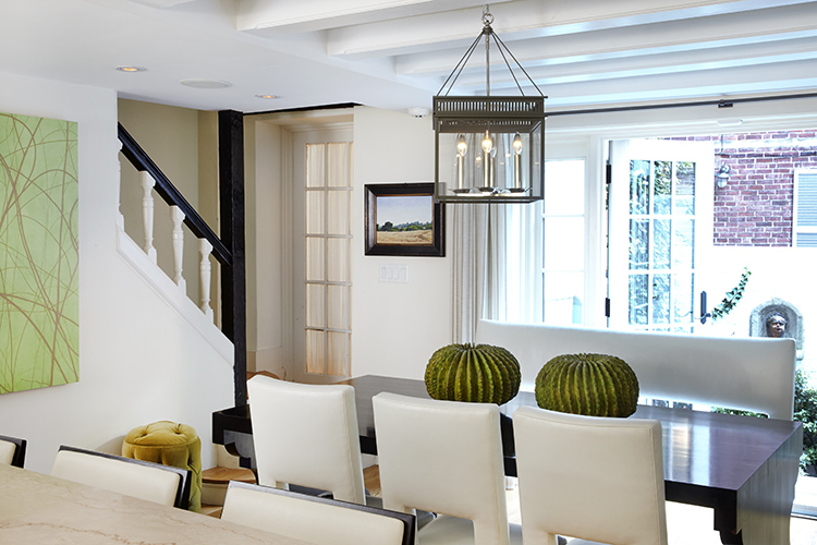 Spiritual artifacts collected from her extensive travels through Asia are present throughout – a pair of antique Buddhist statues, symbolizing protection, by the fireplace and a figurine on the family room mantle. Another key theme is arches. An allusion to new beginnings, the motif subtly graces doorways and furnishings, and a living room photograph of an arched corridor lends the wall a hypnotic infinite quality.