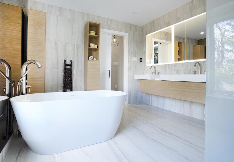 Faucets | Franz Viegener • Vanity and Fixtures | LAUFEN • Hardware | Emtek • Tile | Walker Zanger • Wet Room Floor and Shower Drain | ESS Easy Drain • Lighted Medicine Cabinet | Sidler International • Glass | Beletz Glass • Plumbing Contractor | Stephen C. Rumpf Plumbing & Heating • Radiant Floor Heat | Warmup • Toilet Carrier | Viega • Architecture | SGAHome • Interior Design | Studio Jhoiey