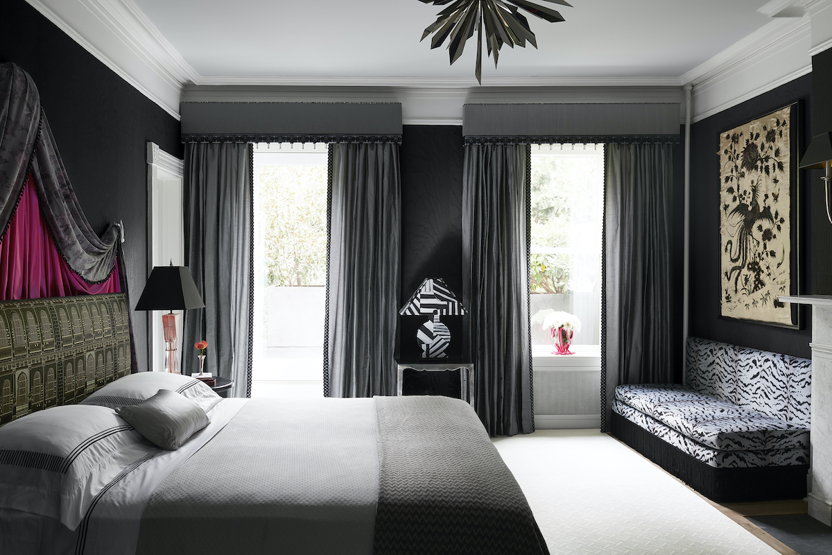 “My bedroom suite is inspired by the Surrealist Movement, and I imagined that my client was Elsa Schiaparelli, who collaborated with the great Surrealists like Cocteau and Dali. The color palette is grayscale, which I got from Cocteau’s La Belle et la Bete, but with touches of the shocking pink that Schiaparelli was known for. The hallway wallpaper is Trompe-l’œil, and over the bed, the curtains are magically opened by a pair of disembodied hands. The artist Thomas Englehart made the surrealist mirror over the fireplace, in the shape of an eye, with eyelashes.”