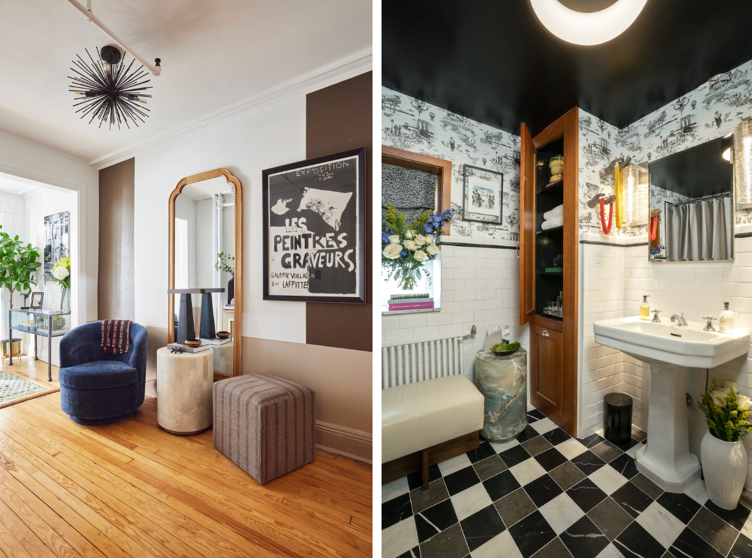 “In the Solarium bath… the Flavor Paper wallcovering brings in Brooklyn elements like Nathan’s, the Cyclone, Biggie Smalls, a Rabbi and so many other elements. And I also added a black and white photograph of a barber shop in Harlem by a local photographer, which is really a safe space for our community. Downstairs in the vestibule, I wanted it to be a place of rest. It has a natural light flowing through it, and it is a place to have a cup of tea or take a phone call or sit down and put your shoes on.”