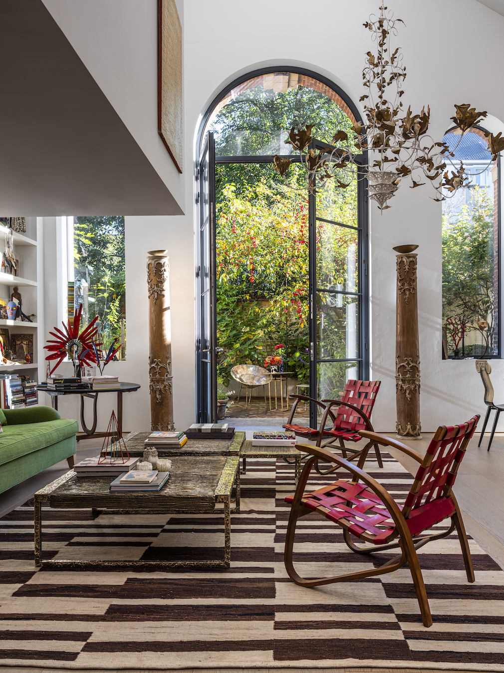 The artist’s signature color is red – a source of energy and warmth. In the living room, a crystalline-like paper chandelier that she designed floats over a vibrant red sofa and complementary leather, thatched chairs from Hungary atop a black-and-white area rug. A pair of antique, 18th-century columns from a pharmacy in Salzburg and a 1950s-era desk made of wood, brass and screen-printed, lacquered wood add to the eclectic ensemble. “I’m surrounded by souvenirs from my many trips around the world,” she notes. “I love to have snippets of past memories lying around the house.”