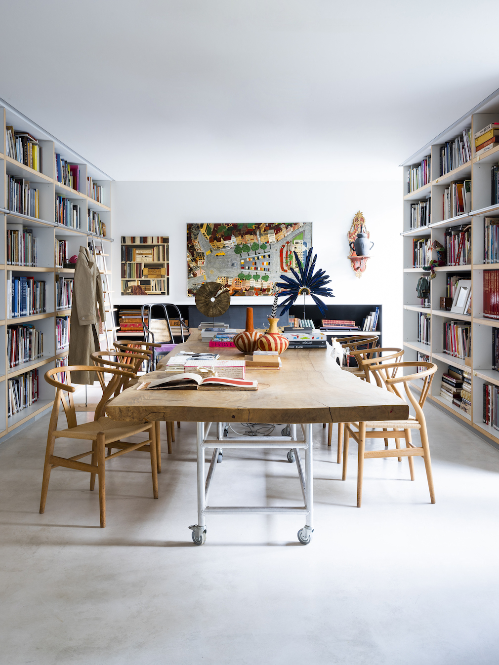 White walls and a mix of concrete and oak floorings create a fitting backdrop for the couple’s extensive collection of artwork, rugs and furnishings, many of which are upholstered in vibrant colors. “I’m obsessed with fabrics and patterns,” de Borchgrave admits.