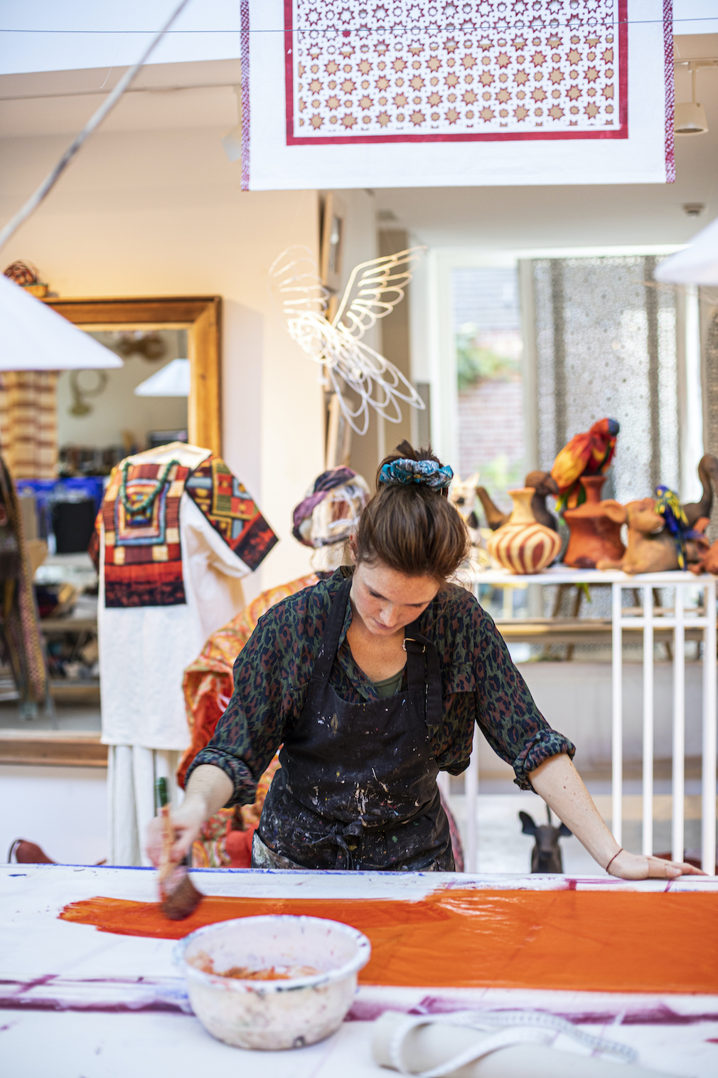 Steps away, a long table with a live edge wooden top from Indonesia makes a delightful space to host dinners, her guests surrounded by a heady mix of artwork that includes her pleated paintings, hand-painted paper vases, and life-size paper reproductions of dresses worn by Frida Kahlo – part of a series of 40 for an exhibition in Brussels. “My studio is like a hive of creativity and colors,” de Borchgrave notes; it’s where she feels most at peace.