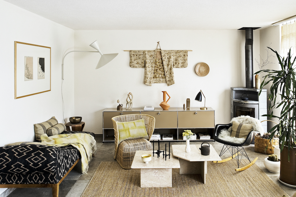 Richards’ approach is evident at every turn. In the living room, she hung a vintage kimono on the wall above a low cabinet from the long-established Swiss manufacturer, USM. Her office is outfitted with a classic Eames molded fiberglass chair and an antique watchmaker’s stool that belonged to her grandparents. A rustic bench found in a French flea market sits at the foot of her bed. For the entrance, she designed a storage unit, which was made by a local carpenter of reclaimed oak from an old Jura farm. Swiss design and craftsmanship are abundantly reflected in the home, with chairs by Moritz Schmid and Max Bill’s Ulm Stool, copper vases and alabaster boxes from Zürich’s Atelier Volvox and bespoke fabrics infused with plant-based dyes from the Lausanne-based studio, Ottuno.