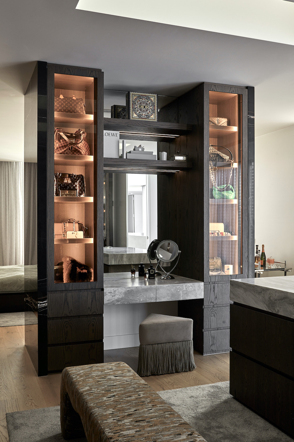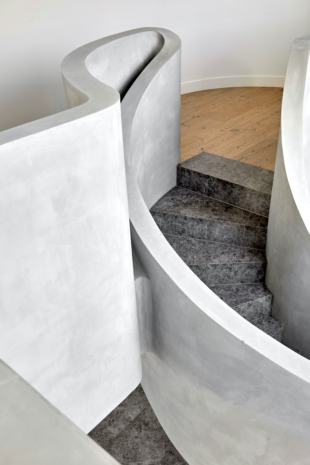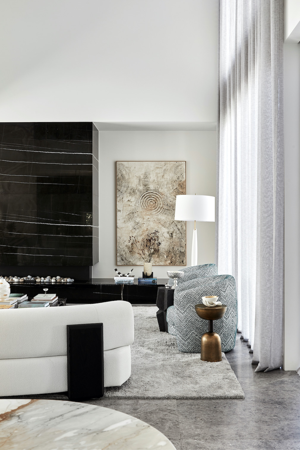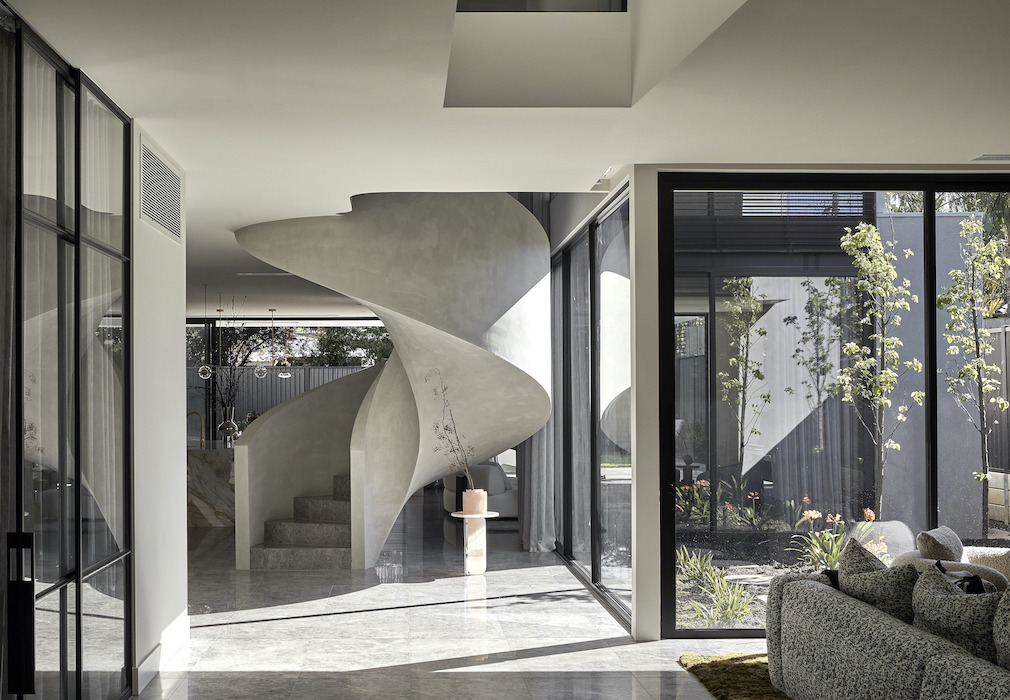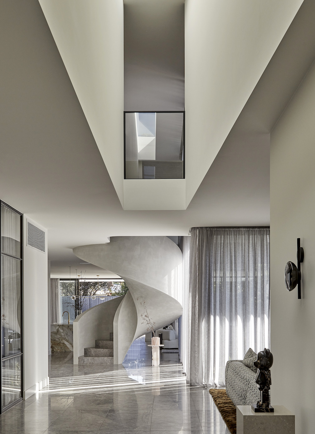 Designed by Jack Fugaro, a well-considered series of spaces celebrate the home’s voluminous proportions, while creating intimate spaces for rest and relaxation. A sculptural staircase located centrally within the floor plate welcomes you on arrival with a gallery-like feel and a sense of being center stage. The more open spaces allow for impromptu meeting moments around the kitchen island and entry foyer.