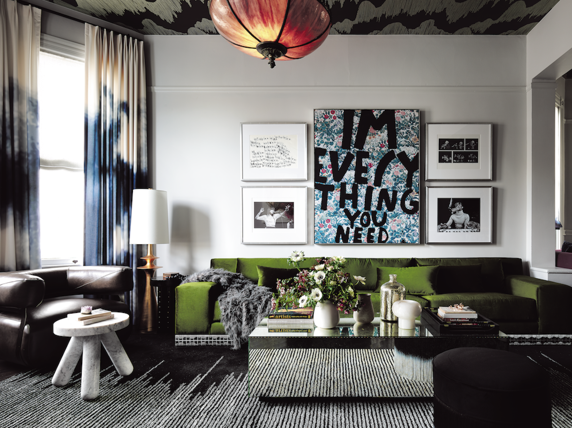 But, notes Schlarb, “You have to balance the green with deeper, more sophisticated colors. It’s a forever strategy” that keeps the room from feeling dated in a few years. So he upholstered a massive custom ottoman in indigo and a bespoke window seat in plum. More wallpaper overhead made the huge space feel cozier and more human scale. Schlarb also practiced the equivalent of pattern mixing by varying materials with abandon – a leather chair next to a bronze floor lamp, near a polished mirror coffee table and a marble side table. The whole thing feels like an extended guitar riff that comprises multiple rhythmic variations on a theme.