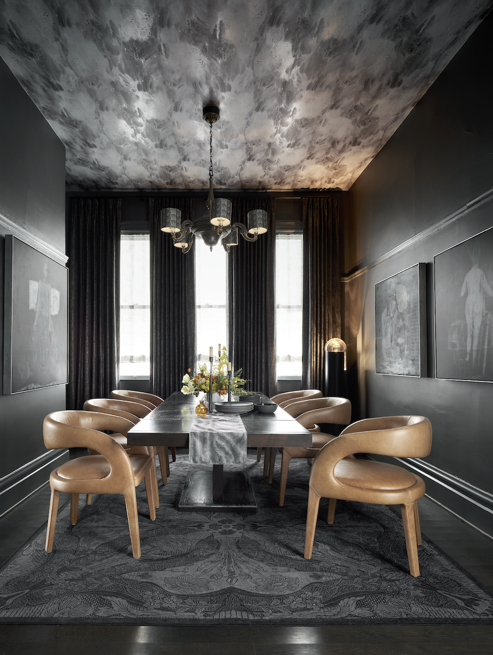 His contrapposto to her wallpaper in the entry was a graphic, almost marble-like patterned stair runner, adding fearless over-scaled graphic flair to its delicate sprays of blossoms. In the dining room, he dressed windows in velvet drapes and linen shades, contrasted a chenille carpet with a patterned grass-cloth ceiling and accessorized the existing chandelier with custom Rubelli shades that emit a moody glow over Ballmer’s own table and chairs.