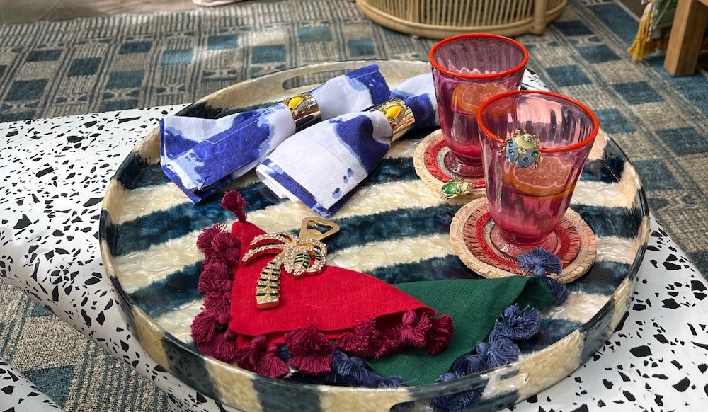 JB: One of the striped Capiz trays used in the showhouse took a very long time to develop, as I wanted to have the underlay of a hand-pieced Capiz pattern and then have hand-painted stripes on top to mimic the idea of tie-dye. Working with our artisans took some time as it is a meticulous process and we wanted to get it right, but we got there and this is now one of our best-selling pieces.