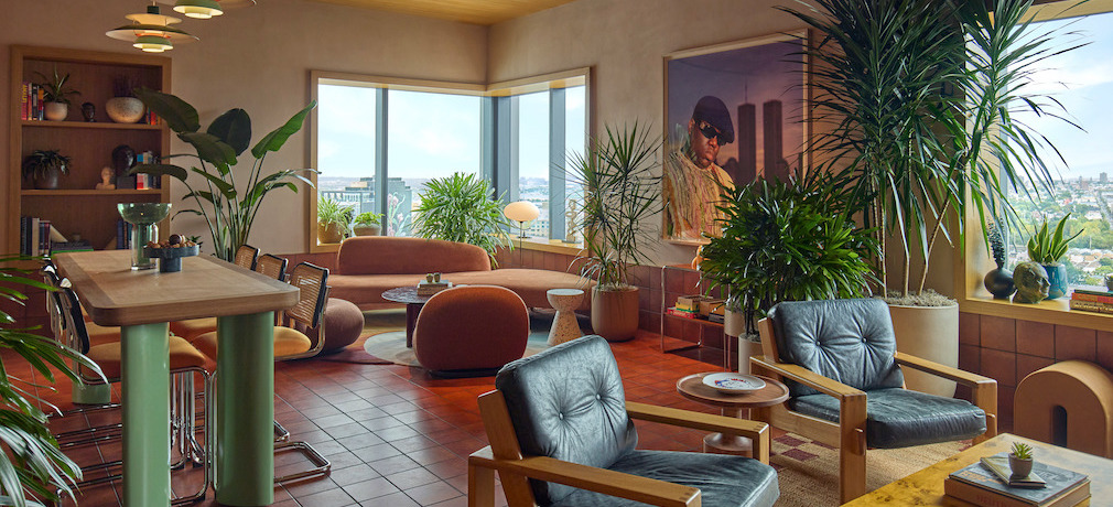 While the ground floor welcomes the public, the 25th top floor is a communal retreat designed exclusively for Urby residents. Just below the tower’s crown, a serene escape rises above the city streets. A garden room and communal kitchen, both filled with greenery, flow seamlessly onto a lush, landscaped deck, creating a peaceful oasis in the sky. The interior space has a very grounded and natural atmosphere, shaped by terracotta floors, wood-clad walls, soft carpets, and a wide variety of seating arrangements surrounded by pots, plants, and balanced lighting. Large, deeply recessed windows framed in wood draw the eye outward, framing views toward Manhattan.