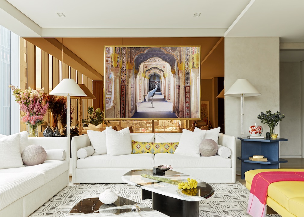 Mesmerized by fine art photographer Karen Knorr’s dreamy image of a regal avian creature in a historic Moroccan castle, Juan Carretero placed it atop a copper-tinted mirrored accent wall in the light-filled living room.