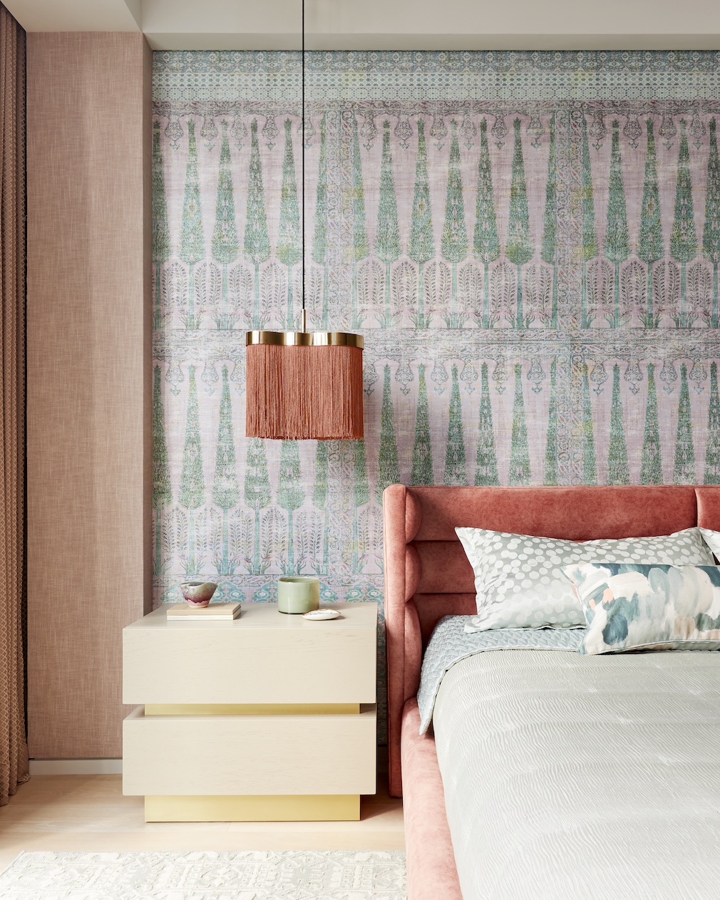An equally pictorial, Moroccan-inspired wallcovering likewise reinforces the Moroccan motif in the elegant primary bedroom. “It’s like exotic Babylonian gardens,” Carretero describes. Fringed bedside pendants and elegant bedding add to the sense of opulence.