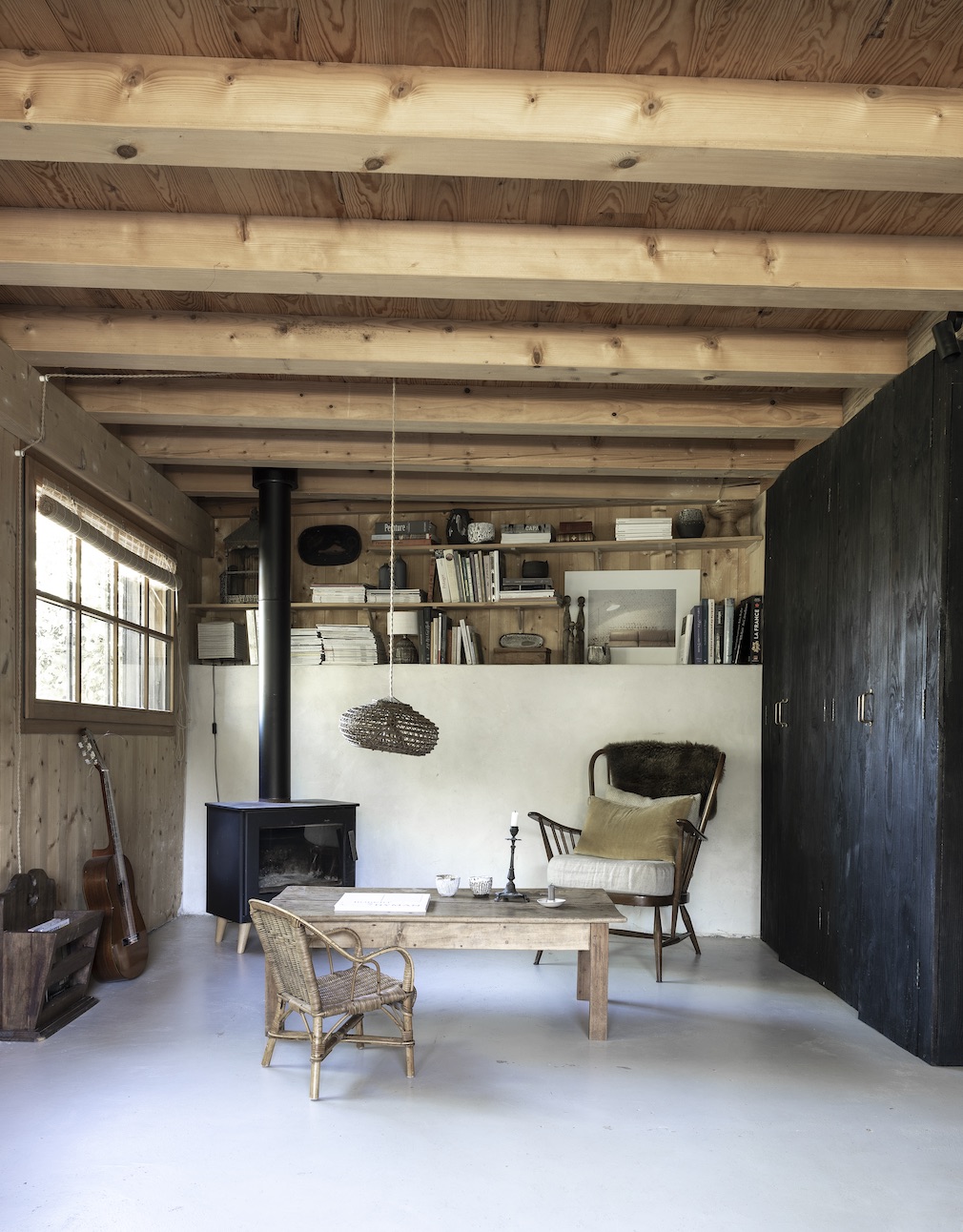 The two decided to make the smaller structure their house and the larger one Justine’s studio. The former was barely standing, so they opted to simply save the stone foundation and erect a board-and-batten cottage atop it. “It is like a fisherman’s hut we had lived in at Cap Ferret,” notes Justine.