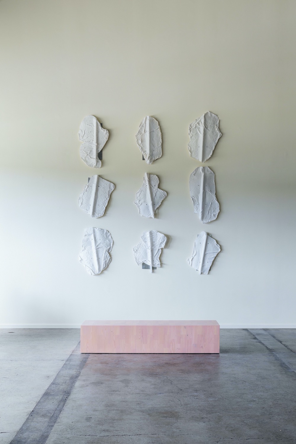 Low pink table and above it, wall-mounted lamps that Willner made using an old Japanese papermaking technique.
