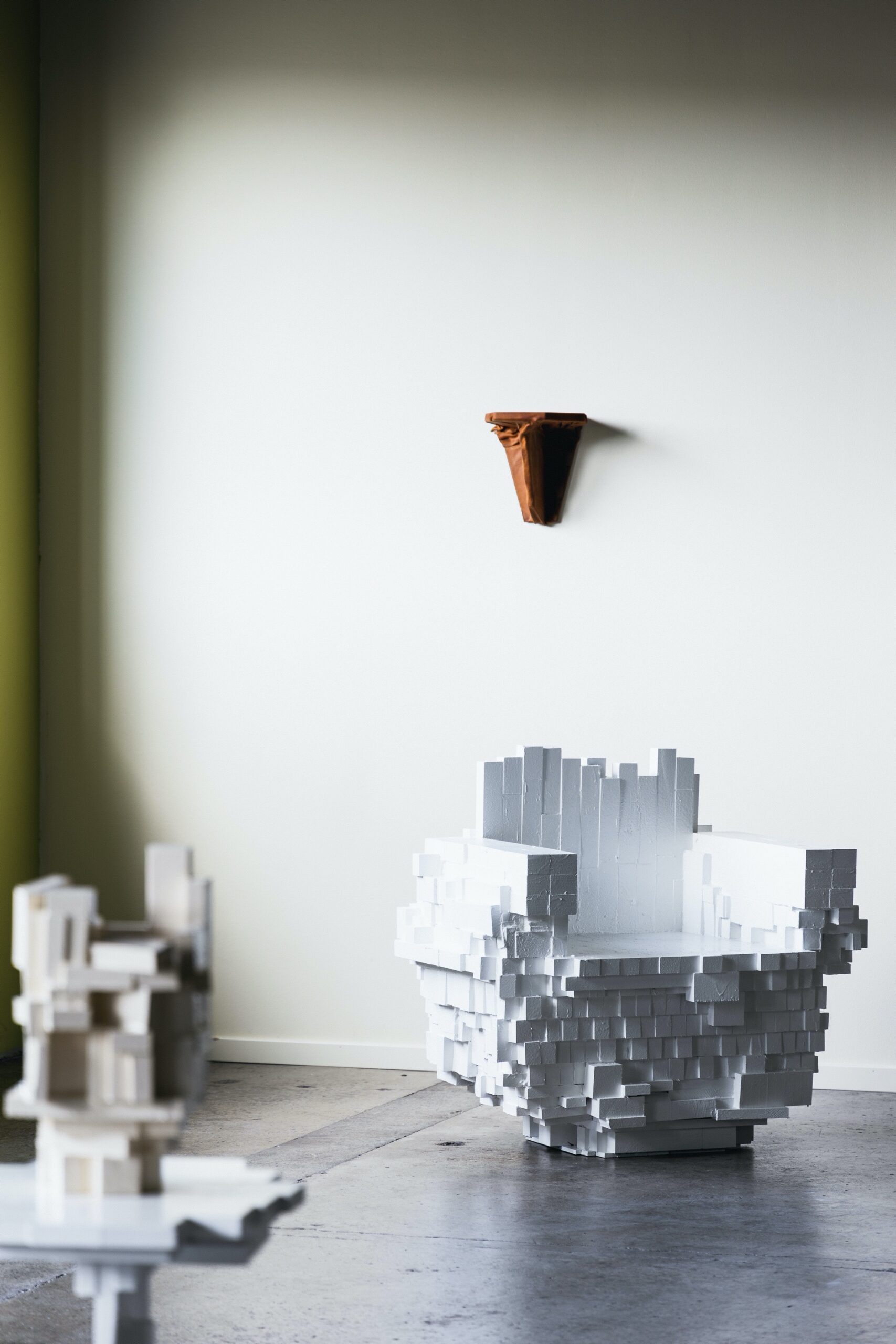 An armchair made from stacked factory remnants has a Lego-like appearance.