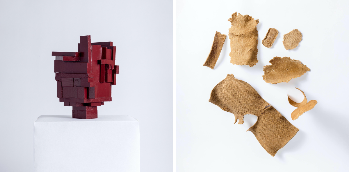 (Left): A big vase made from wood scraps makes a big, bold statement. (Right): Fabric scraps the artist repurposed. Willner examined the potential of various approaches, such as material development, upcycling, craft techniques, collaboration and implementation.