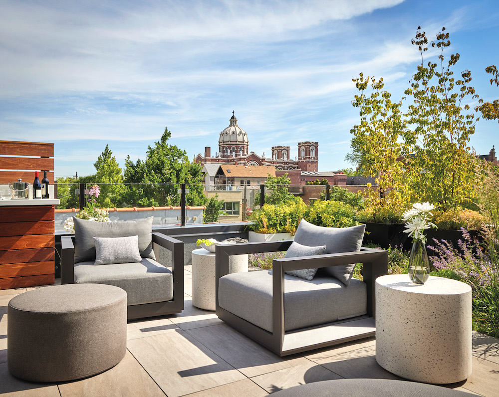 “The homeowners love to entertain, and they wanted different options in different areas of the home so that they could move around the house,” says Kartheiser, alluding to the gorgeous rooftop patio overlooking the 606 walkway.