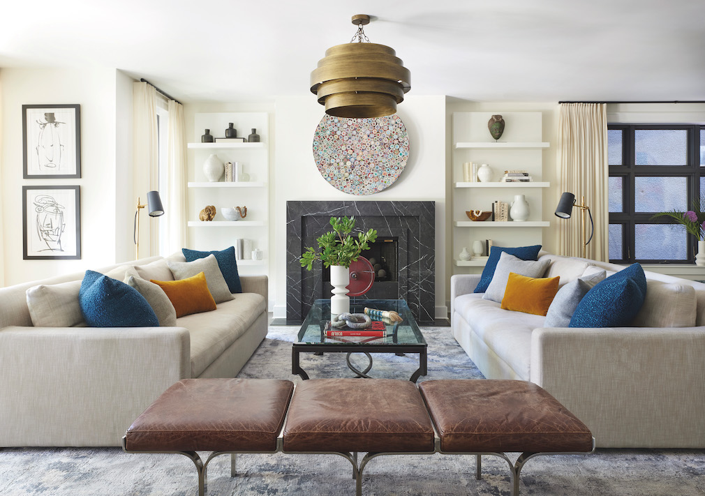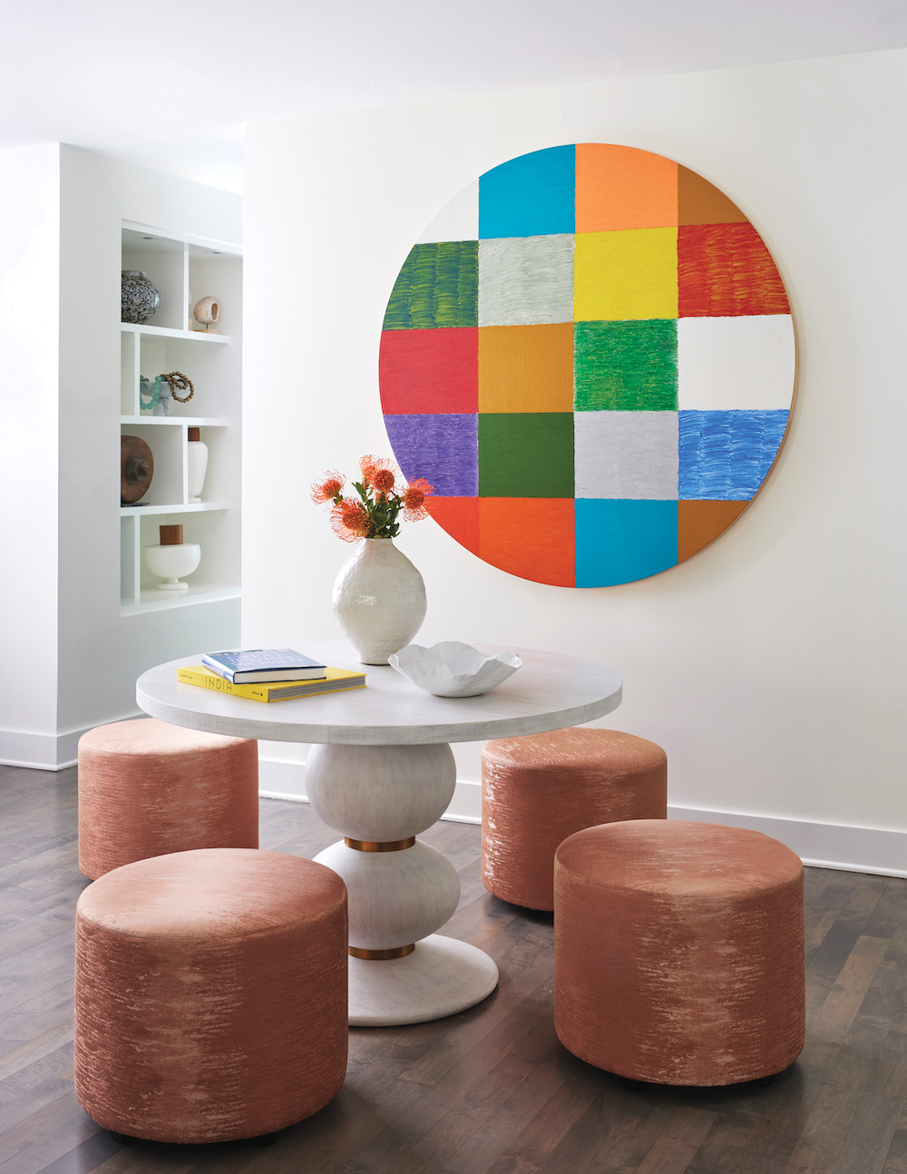 Center stage, indeed. Walking into the grand living room, one is immediately struck by the range of bright, colorful artwork dotting the walls, especially the show-stopping piece above the fireplace that “We completely reimagined where all the art would be and played around with it,” says Kartheiser. Holly Hunt fabric envelops the large windows, and the rug is by Ashley Stark.