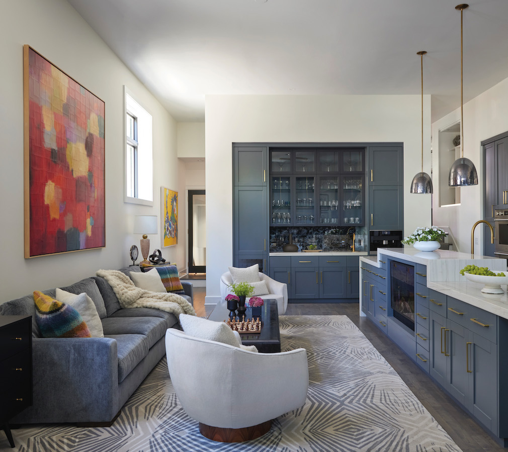 These fun ‘pops’ stand in contrast to the muted, galley-esque kitchen and adjoining wet bar swathed in a calming shade of gray blue. “The island is super, super long to fit the kitchen, which you could almost consider a galley kitchen, but they have everything they need between those two areas,” says Kartheiser, adding that they brought up all the ceilings to make the kitchen cabinets look inset into the wall.