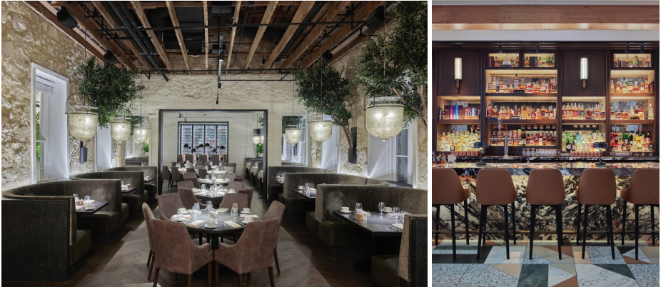 In Kimpton Santo’s much-loved Dean’s Steak & Seafood restaurant, Deary wanted to “expose as much of the space” as possible so they could tell its story without adding unnecessary details. She and her team removed the millwork, exposed the old brick and rafters, and brought in preserved olive trees to treat the space as an extension of the historic courtyard. “Original material like that is priceless, you have to include it and let it tell its story — it’s a gift that keeps on giving,” explains Deary.