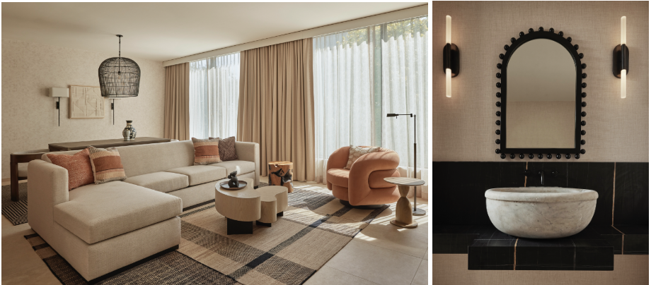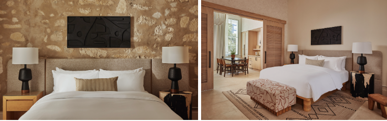 Last, but certainly not least, the 19 historic guest suites received a gorgeous application of thoughtful design. “We leaned into what a contemporary San Antonio residence would feel like, almost with a Nordic eye,” says Deary of the suites located in the old school house. “We didn’t want to lose the cultural aspects of the original design elements, and since the space is much older, we balanced that with authentic components that were more modern,” she continues. Her approach resulted in tailored, impeccably designed retreats that exude comfort and feature a warm, neutral palette complemented by textural accents such as woven and grass rugs. In the new tower, 347 stylish guest rooms showcase an elegant layering of artisanal textiles and finishes that form an inviting, warm ambiance within a sleek, modern architectural frame. Meanwhile, the suites in the former schoolhouse offer views of a lush courtyard framed by century-old live oak trees.
