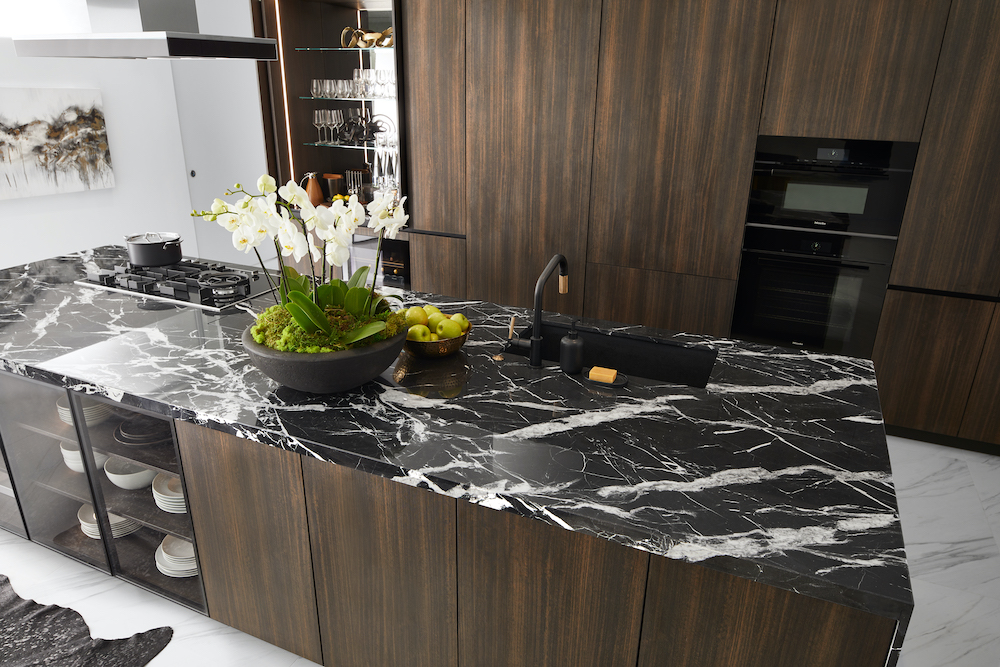 The project began when the clients stepped into an eggersmann showroom and met Kegan Wilson, a designer for the brand. Though the couple was initially inspired by a luxurious-yet-practical display they spotted in the Chicago showroom, the setup was a bit above their budget. Fortunately, Wilson found the perfect solution: A waterfall counter made with Nero Carrara marble, wood laminate cabinetry fronts, and, of course, strategically placed storage.