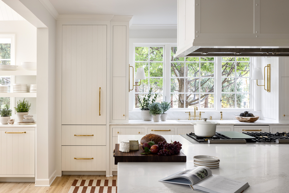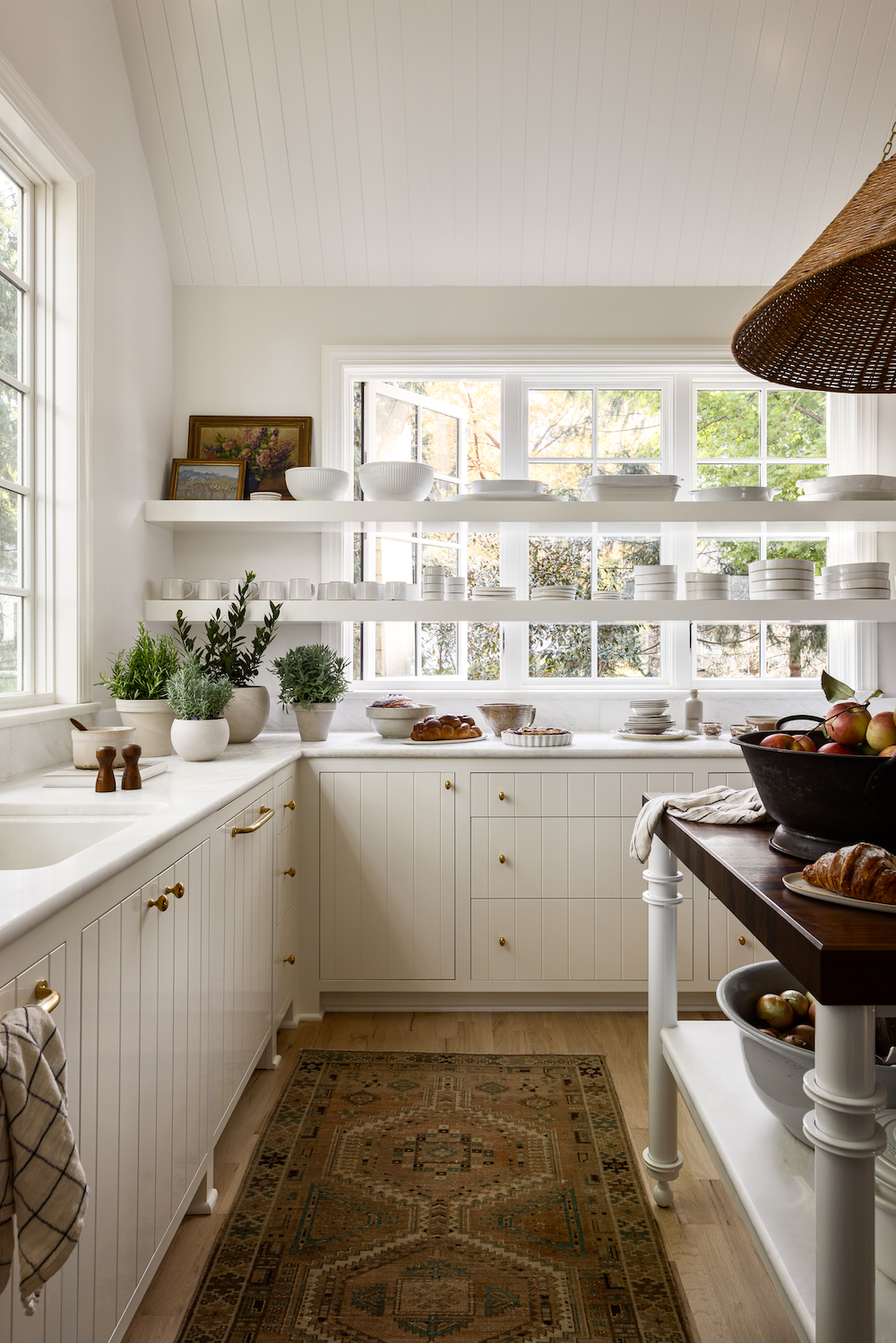 The old kitchen in the Midwestern property, built in the 1990s, was closed-in and cramped, with the island at an awkward angle. In addition to breathing air into the layout, the team added cookbook shelves with ledges so the books lay flat and the covers face out, new white dishes to restart from scratch and airy greens in pretty pots. They modified the windows and casings for a more open feel. Despite the dramatic improvement, the footprint was not increased.