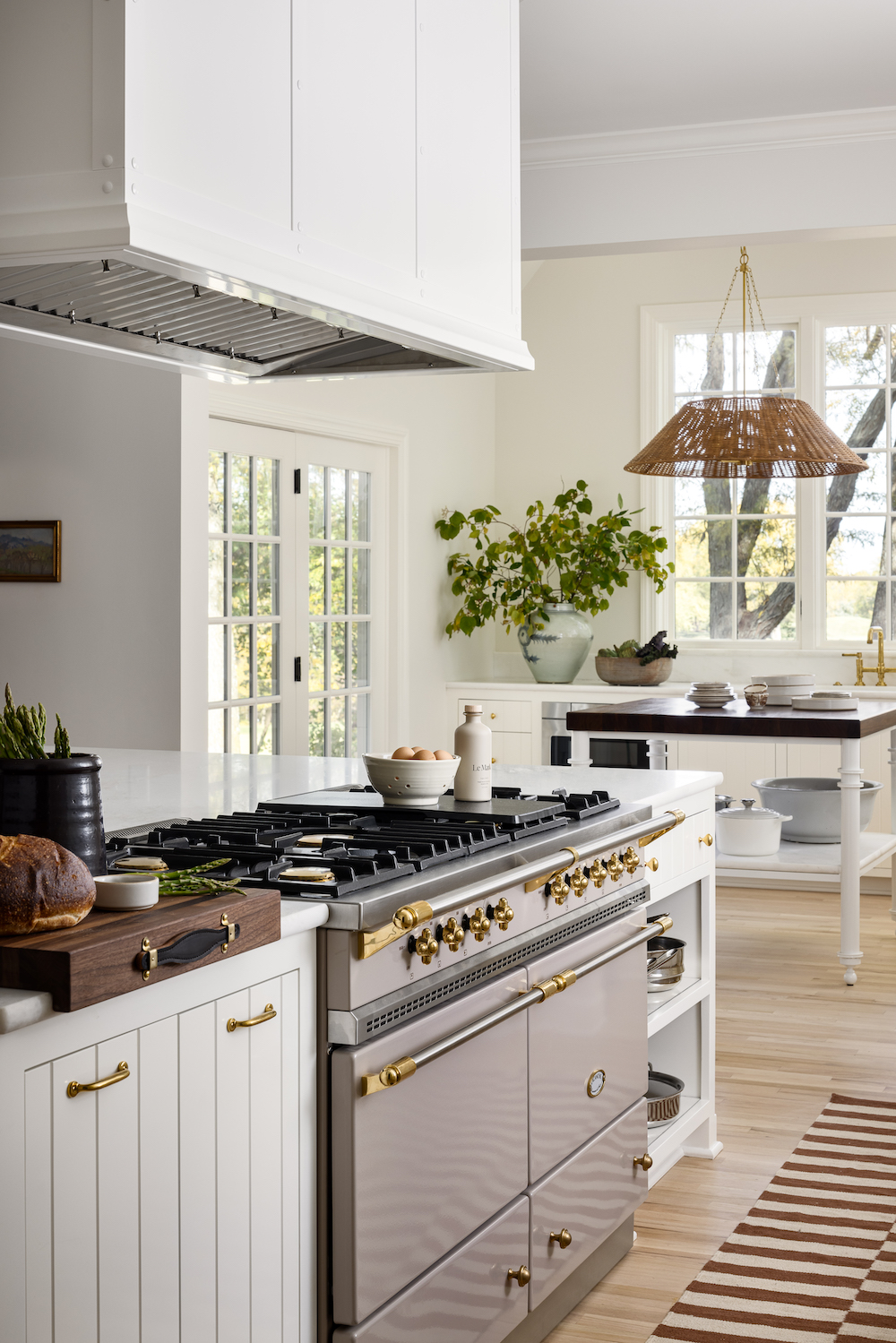 “We often strive for uninterrupted islands without sinks and seams, but the Lacanche Range in Frangipane hit every functional goal of the client and is a visual showstopper.” In an elegant warm, mushroomy tone, the aesthetic anchor inspired other color accents. The pendant lighting with woven basket shade by Marie Flanigan for Visual Comfort adds interest but doesn’t overwhelm the room.