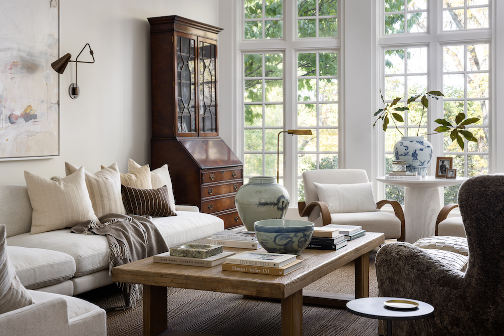 It was important that the final design reflected a fresh aesthetic but also incorporated pieces of family history. In the living room, for example, the heirloom wood secretary, with its drop-down desk, glass doors, shelves and drawers, is set off by a contemporary salt-of-the-earth coffee table, wood-frame chairs, and comfy upholstery and carpet in neutral colors.