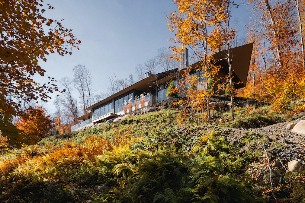 Nestled along the wild northern shores of Lake Tremblant, La Flèche is a Quebec residence that reimagines the mountain chalet with contemporary elegance. Noble, vernacular materials firmly anchor it into the rugged site, while its sharp, angular roofs carve boldly into the sky.