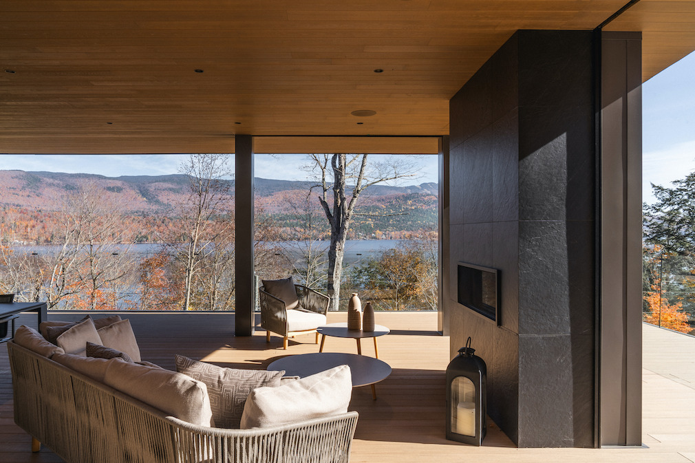 At the end of a long, meandering drive through the woods, the residence emerges as a tranquil retreat, ideal for extended family holidays. The experience begins at the covered entry terrace, cleverly concealed behind retractable insect screens, creating an extension of the indoor living space. Here, the view reveals itself in full splendor.
