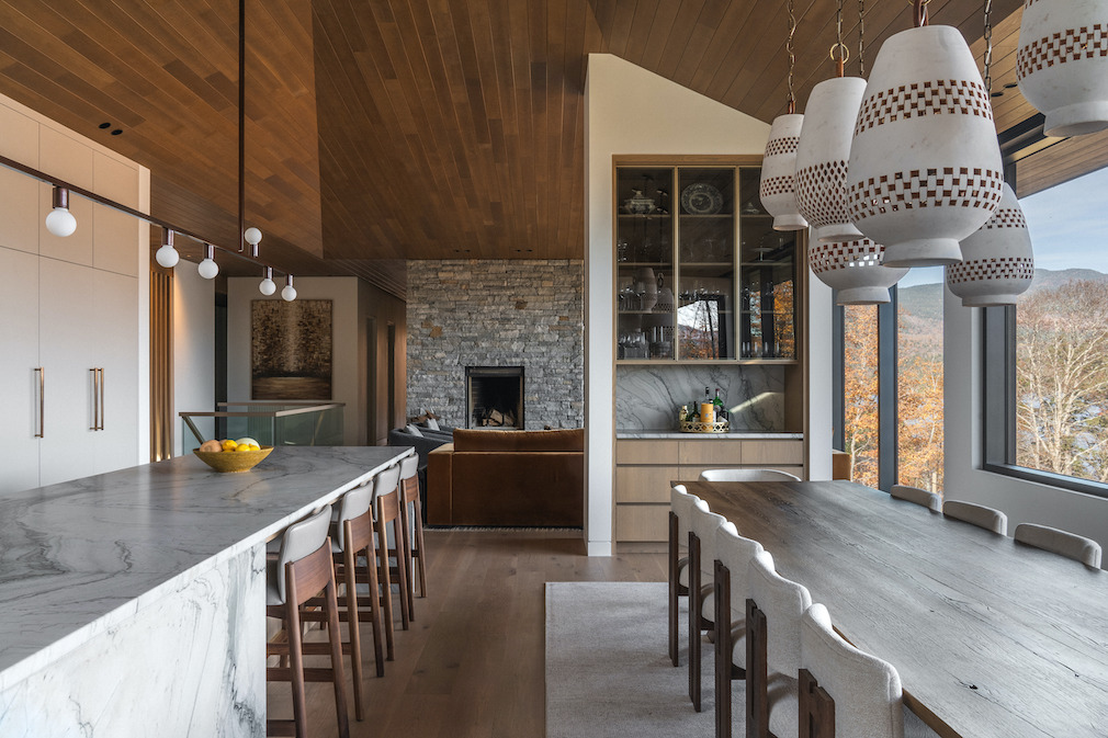 Completely clad in wood, the ceiling follows a complex triangulation that modulates the interior volume: lower and cozier above the living area, gradually rising over the kitchen to culminate in a dramatic skylight. The kitchen itself is expansive and bright, featuring a large island and a ribbon window above the counter that allows views of approaching guests. Hidden behind a paneled wall lies a full-service pantry kitchen with its own design character and equipment.