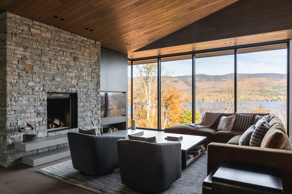 Behind an elegant screen of angled, staggered wood slats, a glass-lined staircase leads downward, offering panoramic views toward the living room and inviting discovery of the lower-level spaces. The main living room, adorned with a monumental stone fireplace and wrapped in a warm wooden ceiling, beckons for rest and contemplation. Indeed, the views over Lake Tremblant and its namesake mountain are nothing short of spectacular.