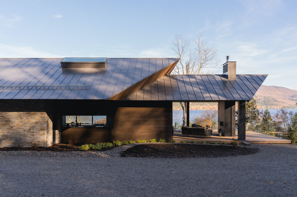 Evoking an arrow or harpoon, the rooflines of La Flèche thrust skyward, their succession creating a dynamic rhythm. The distinctive architectural gesture — overlapping roofs that telescope upward — welcomes visitors with drama and flair. The razor-thin eaves and seamlessly integrated ventilation details give the home a precision-cut appearance.