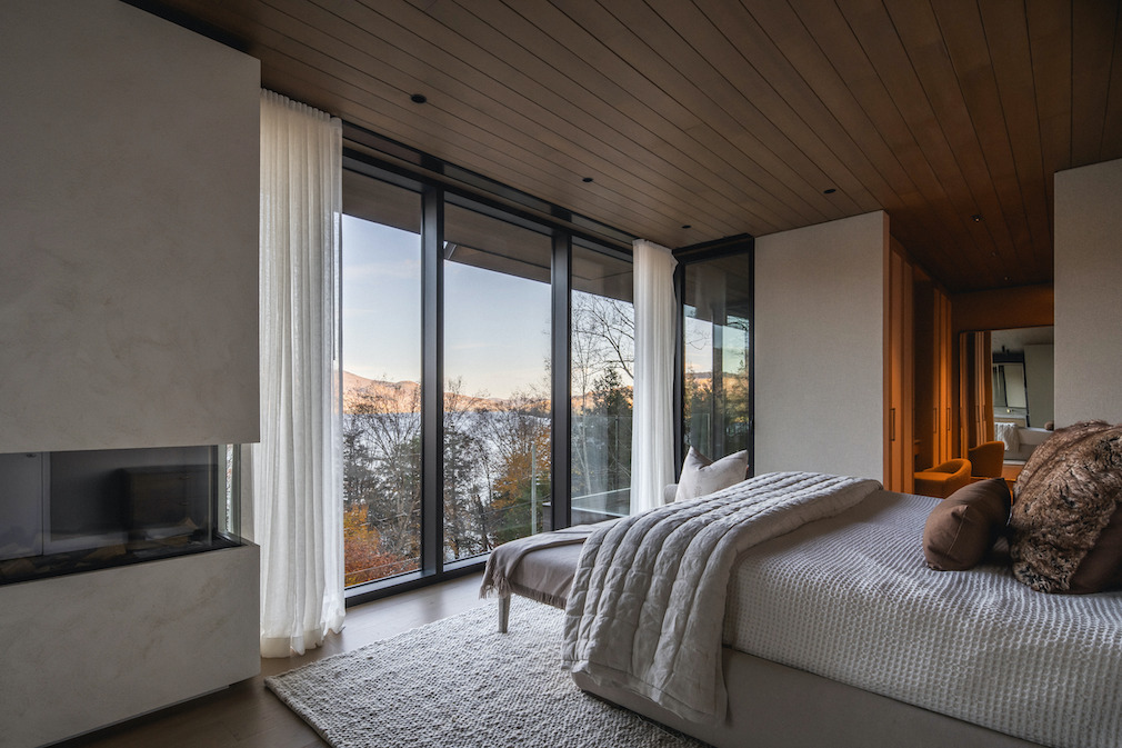 Discreetly integrated along the path to the primary quarters, a hidden access leads to a full guest suite that opens onto a private view of the forest. The primary suite itself offers a generous bedroom with a fireplace and sweeping views of the lake and Mont Tremblant. In the ensuite bathroom, open to the bedroom, a large, stone-textured shower evokes a carved-out grotto. The mirror is positioned to reflect the view, which is also visible from the freestanding tub. A walk-in closet with fabric-clad doors reminiscent of grand hotels and a private balcony complete the suite.