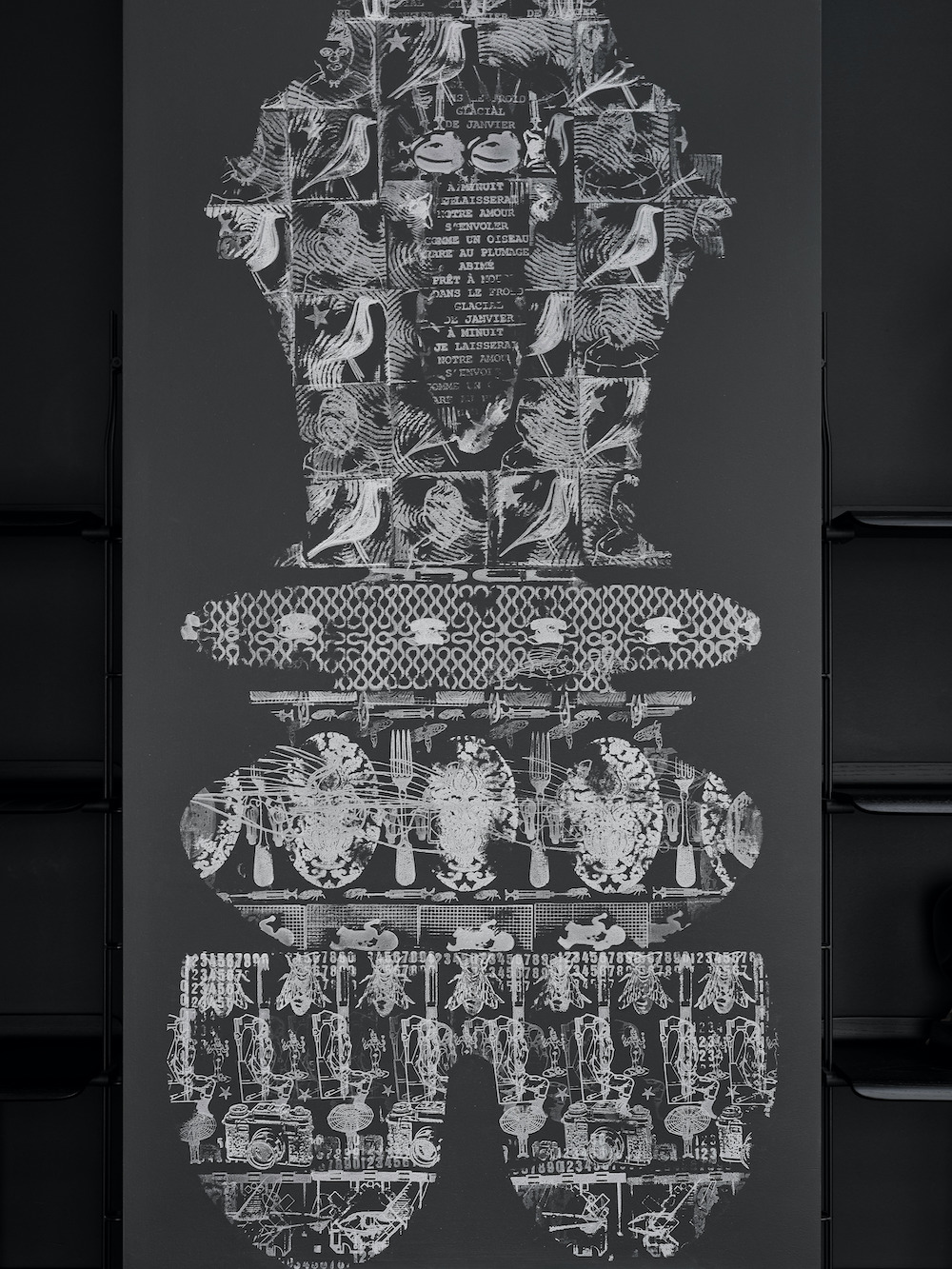 The fireplace is the canvas for a piece created on site by Morelli in the tradition of home wall drawing. For this work, called La nuit, tous les chats sont gris, five images were produced and translated using stamps to complete images already existing in Morelli’s work. The mural, the first to be printed on black support, inspired a series on canvas called Les grandes eaux nocturnes, which is available at the Chiguer Art Contemporain gallery.
