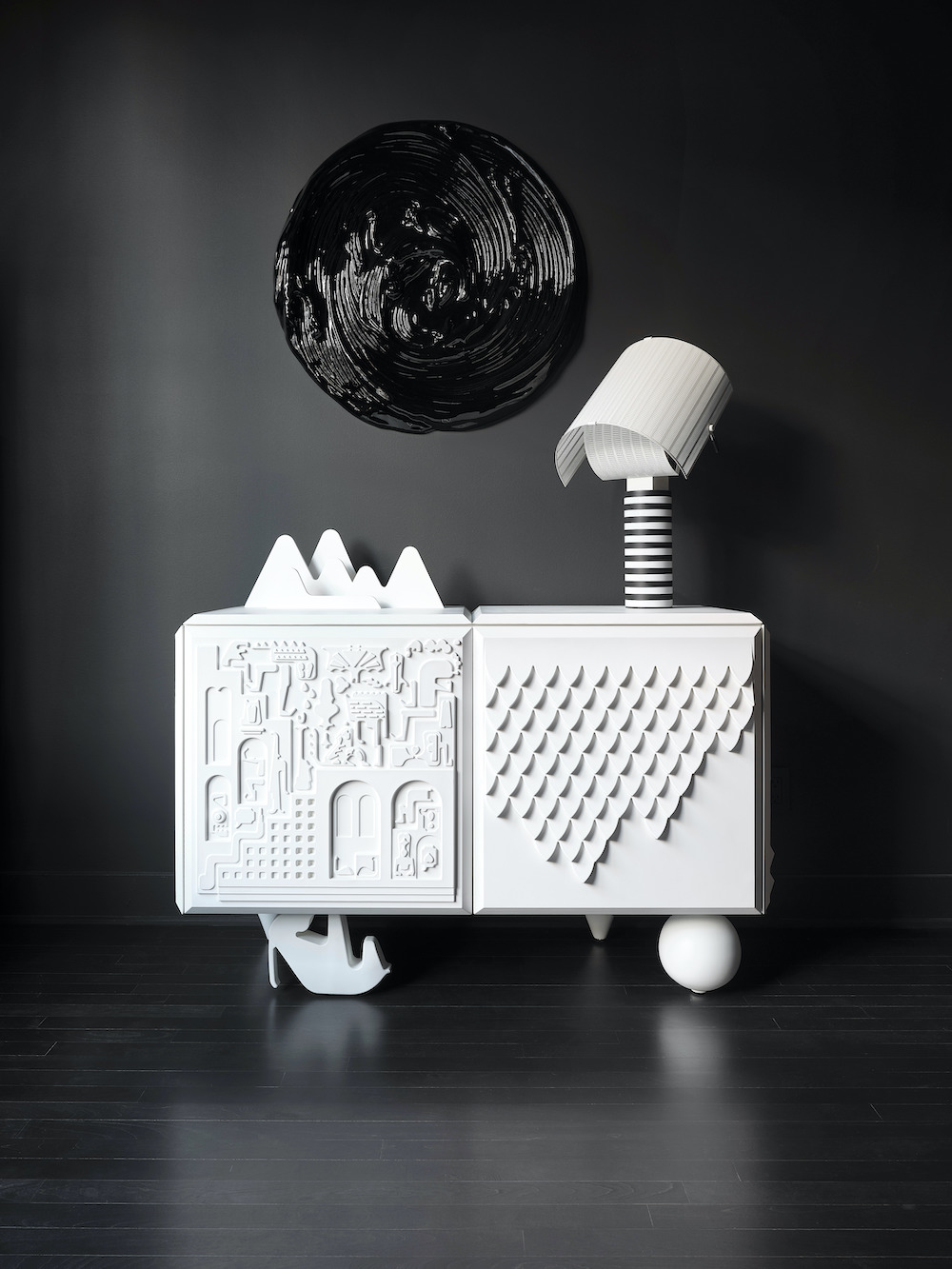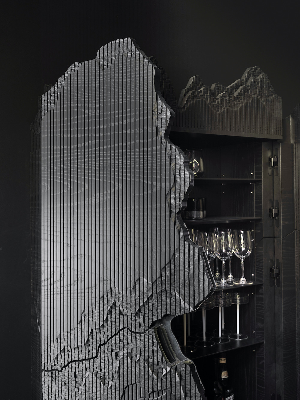 Simon Johns is a designer who lives and works in Bolton-Est, in Southern Quebec. His artistic process is centered around unique and sculptural furniture and lighting made in limited series. Pictured, the Ledge Dry Bar is a floating wall bar. Its sculpted solid ash surface represents the textures of cliffs collapsing around the studio. The interior has two surfaces in solid wood to house a bottle collection and an adjustable shelf in smoked glass for glassware.
