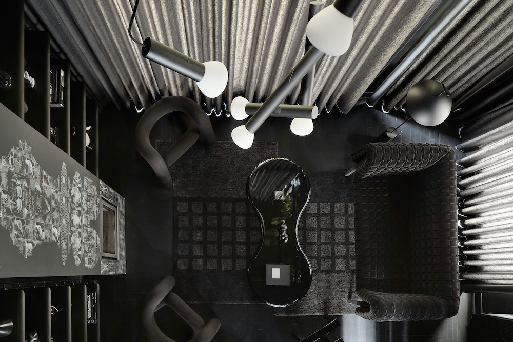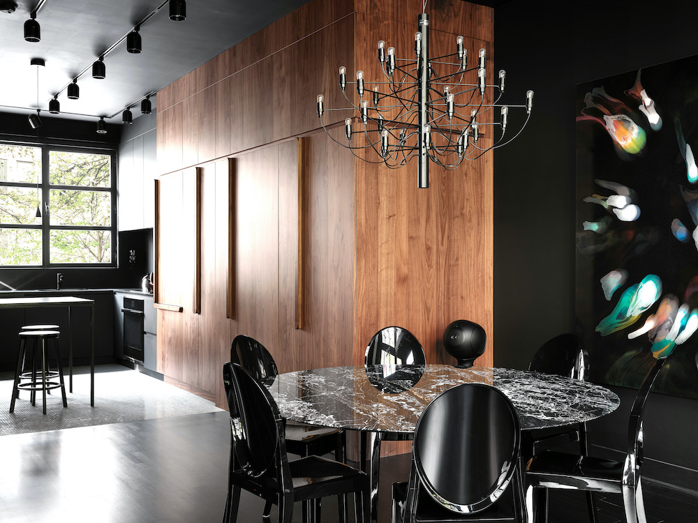 Furniture, lighting fixtures, objects, and artworks, including an in-situ piece by Quebec artist François Morelli, all revolve around the master color of black. The color choice amplifies the theatrical effect, bringing together strong pieces of design from yesterday and today in a rich, soothing visual signature rarely used in residential interiors. Both furniture and artworks blend into a neutral palette, at times enhanced by white and black walnut.